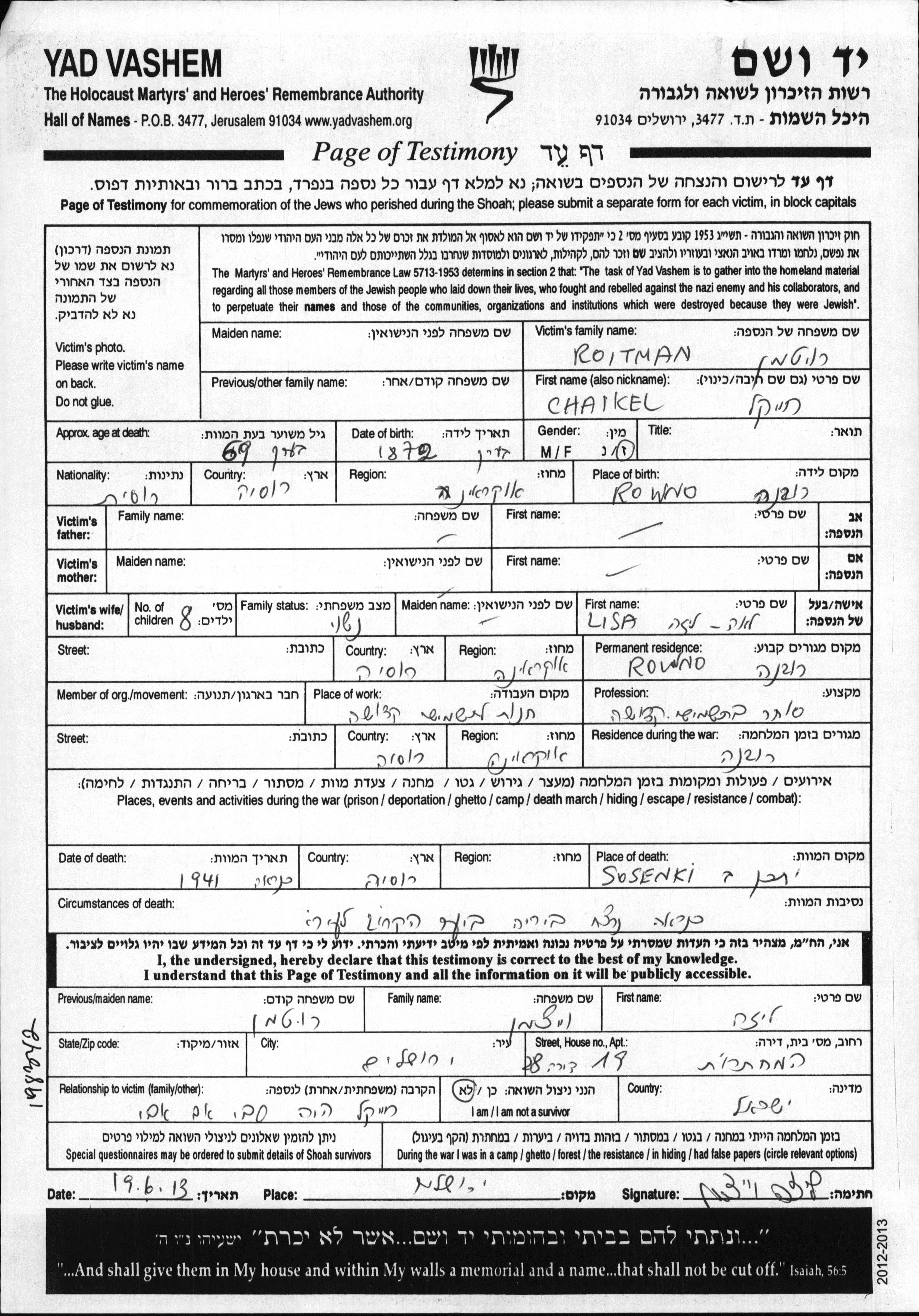 Chaikel Khaikel Roitman wurde im Jahr 1872 in Rowne, Polen geboren. Er war Kaufmann/-frau und mit Lisa Lea Verheiratet. Vor dem Zweiten Weltkrieg lebte er in Rowne, Polen. Während des Krieges war er in Rowne, Polen.