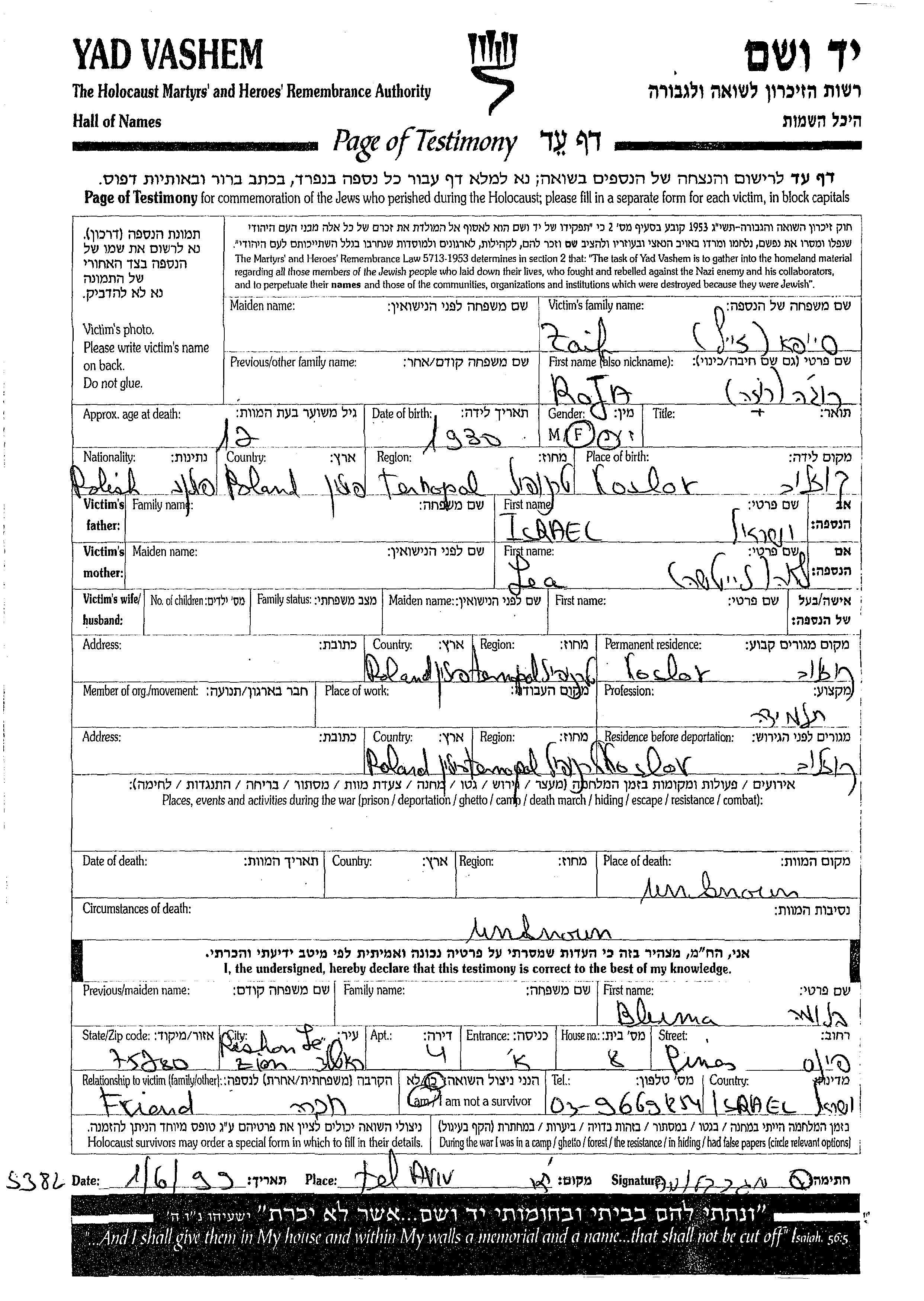 Roja Zaif wurde im Jahr 1930 in Kozlov, Polen geboren. Sie war die Tochter von Israel und Lea. Sie war Schüler/-in. Vor dem Zweiten Weltkrieg lebte sie in Kozlov, Polen. Während des Krieges war sie in Kozlov, Polen.