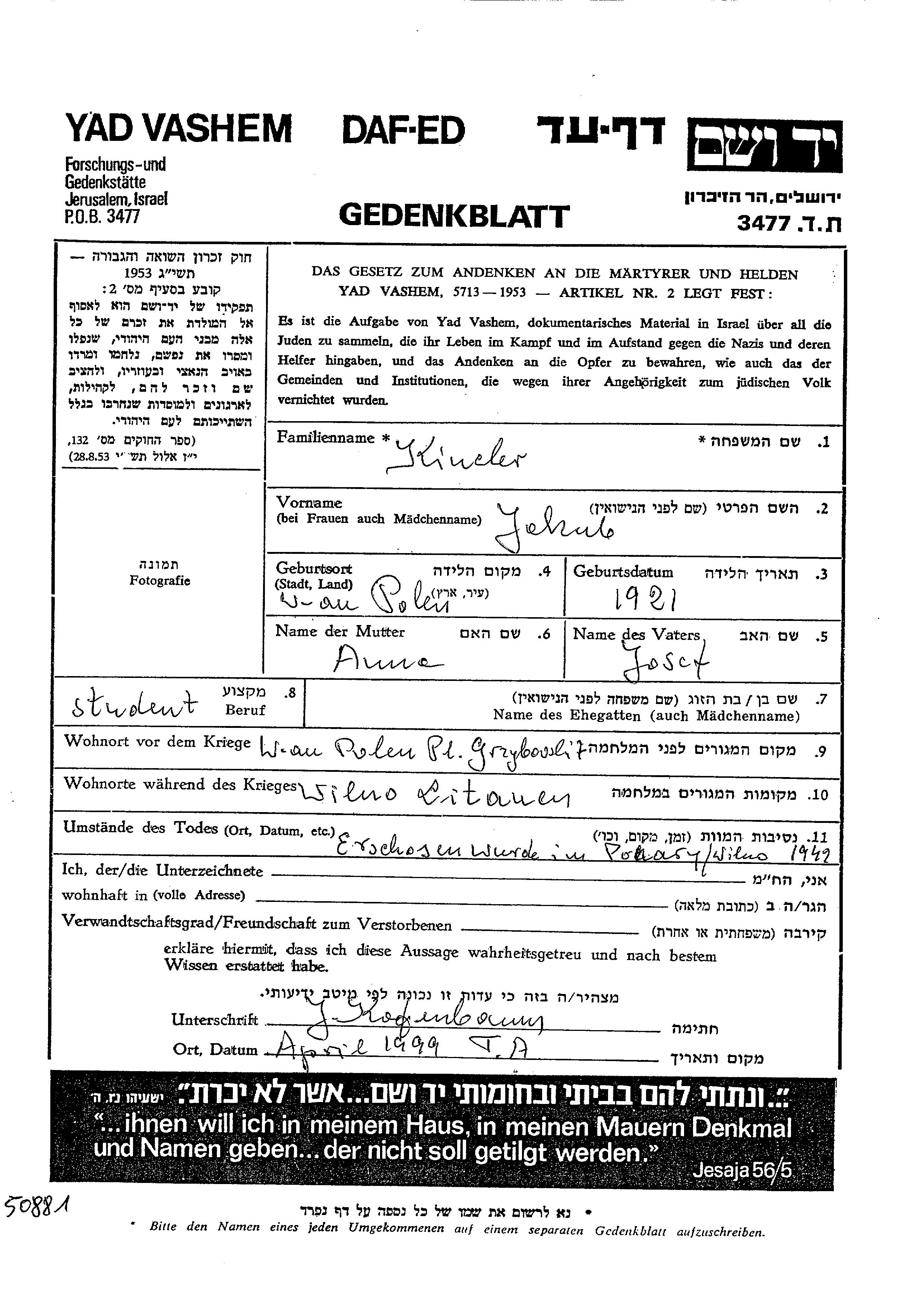Jokob Kincler wurde im Jahr 1921 in Warszawa, Polen geboren. Er war der Sohn von Josef und Anna. Er war Student. Vor dem Zweiten Weltkrieg lebte er in Warszawa, Polen. Während des Krieges war er in Wilno, Polen.