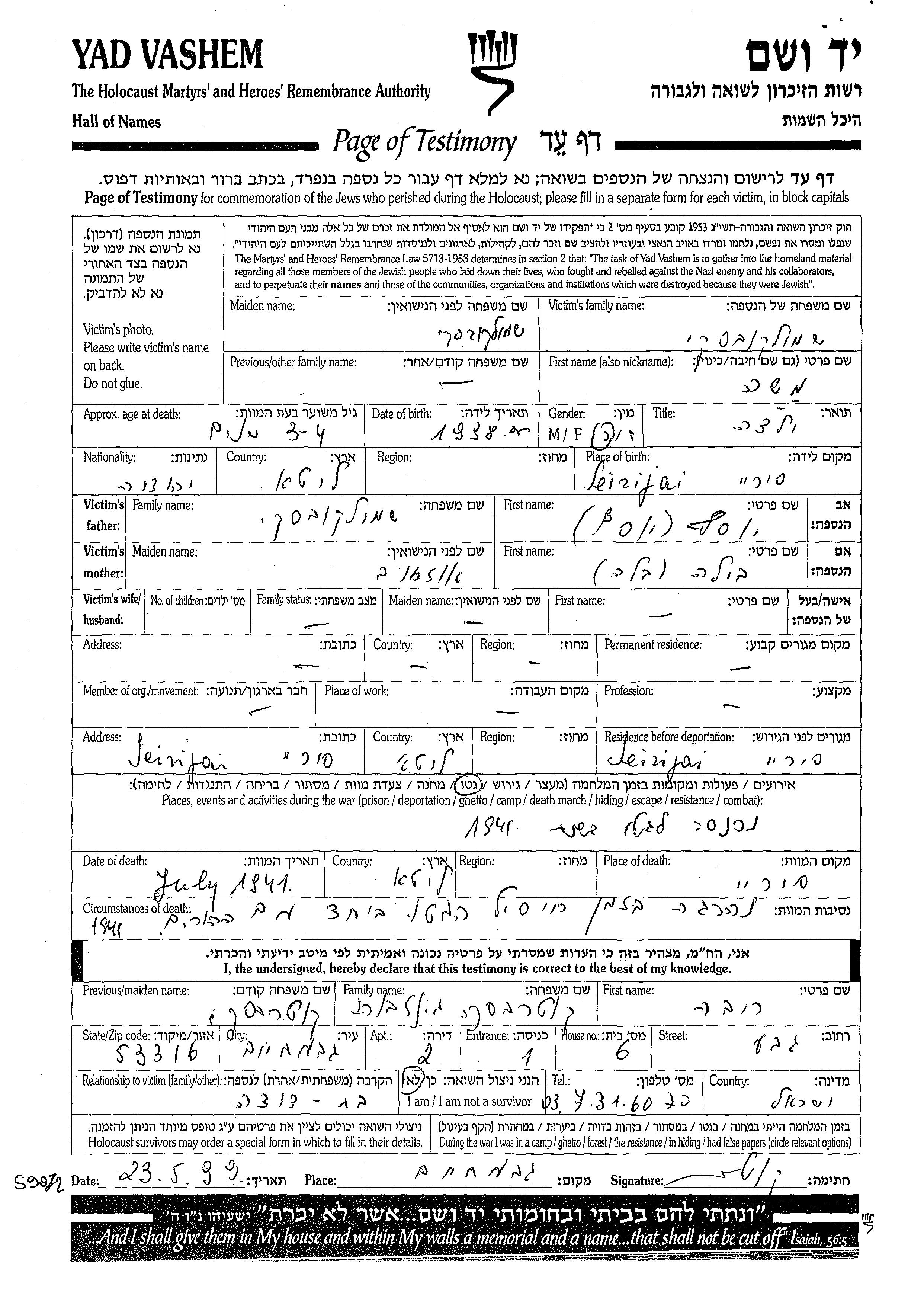 Shmulakovski Moshe 1938 unbekannter Ort, Gedenkblatt