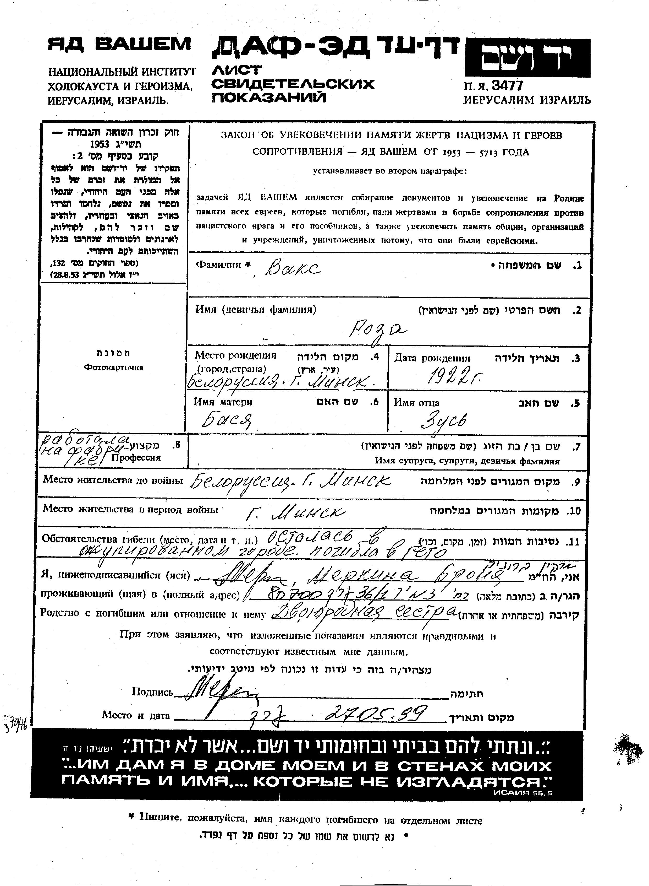 Roza Vaks wurde im Jahr 1922 in Minsk, Weißrussland (UdSSR) geboren. Sie war die Tochter von Zus und Basya. Vor dem Zweiten Weltkrieg lebte sie in Minsk, Weißrussland (UdSSR). Während des Krieges war sie in Minsk, Weißrussland (UdSSR).