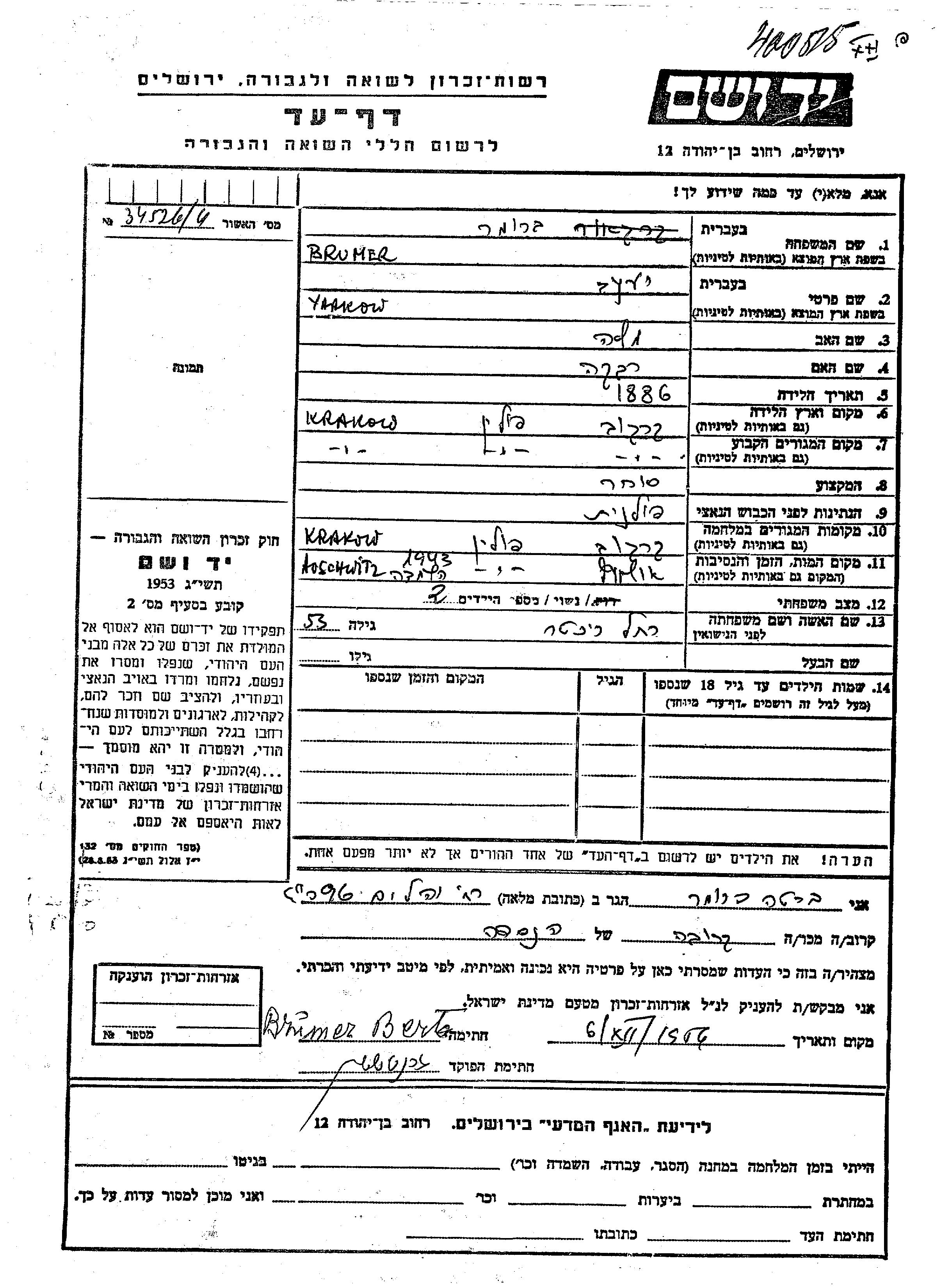 Yaakow Brumer wurde im Jahr 1886 in Krakow, Polen geboren. Er war der Sohn von Moshe und Rivka. Er war Kaufmann/-frau und mit Rakhel, geb. Rikhter Verheiratet. Vor dem Zweiten Weltkrieg lebte er in Krakow, Polen. Während des Krieges war er in Krakow, Polen.