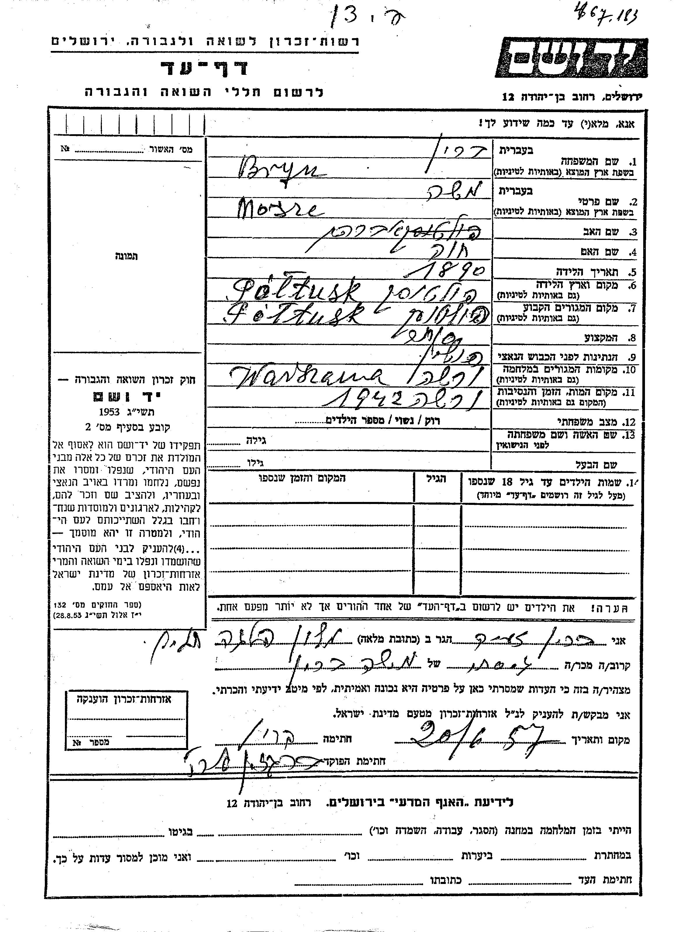 Mosze Bryn wurde im Jahr 1890 in Poltusk, Polen geboren. Er war der Sohn von Avraham und Khava. Er war Kaufmann/-frau. Vor dem Zweiten Weltkrieg lebte er in Poltusk, Polen. Während des Krieges war er in Warszawa, Polen.