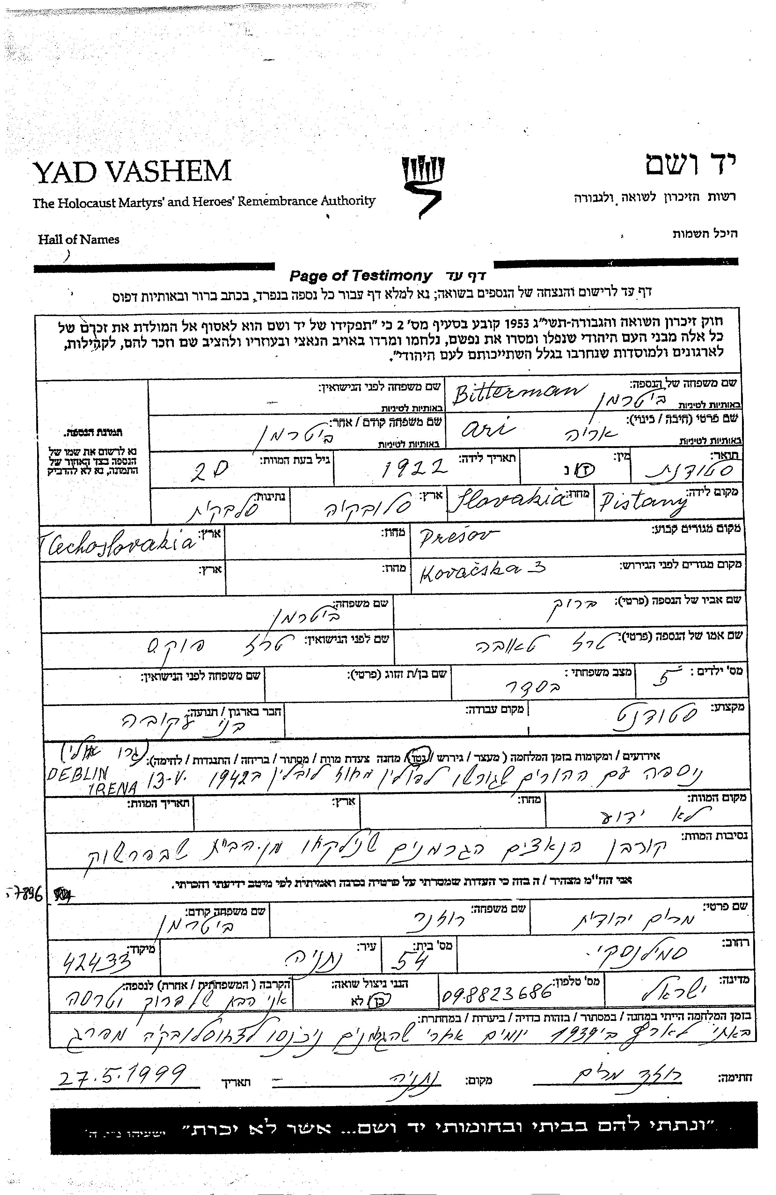 Arie Bitterman wurde im Jahr 1922 in Pistany, Tschechoslowakei geboren. Er war der Sohn von Barukh und Terez Tauba. Er war Student. Vor dem Zweiten Weltkrieg lebte er in Preszow, Tschechoslowakei.