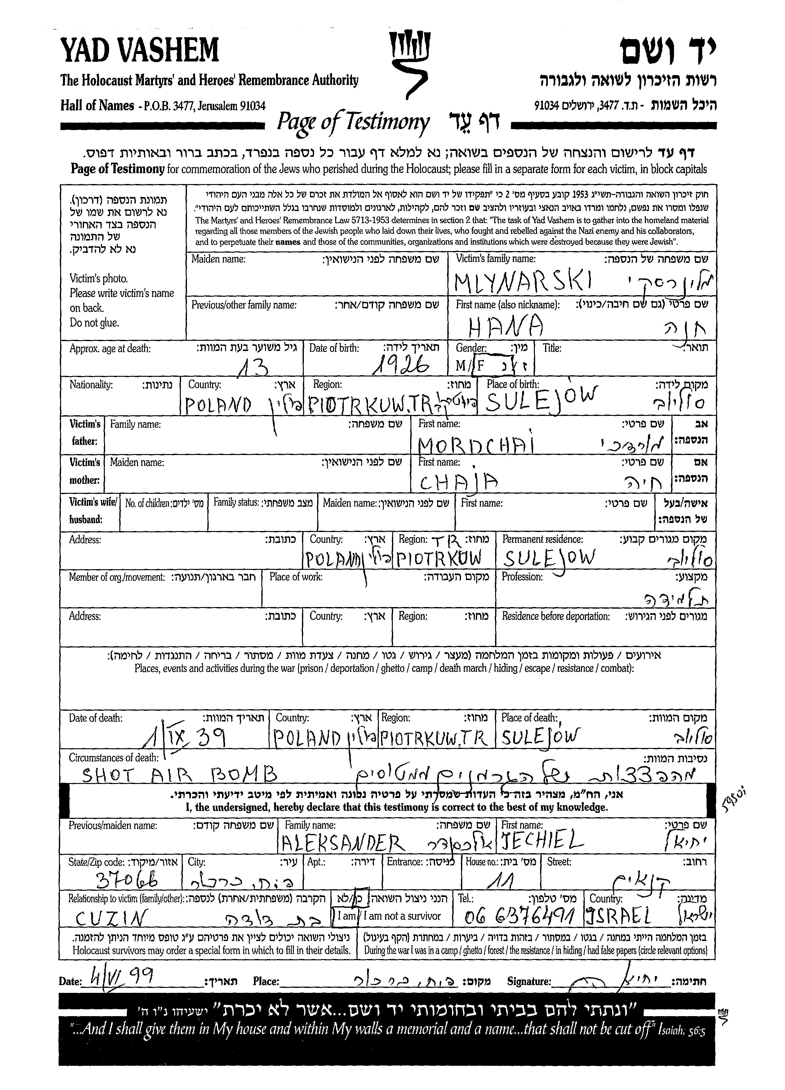 Hana Mlynarski wurde im Jahr 1926 in Sulejow, Polen geboren. Sie war die Tochter von Mordchai und Chaja. Sie war Schüler/-in. Vor dem Zweiten Weltkrieg lebte sie in Sulejow, Polen.