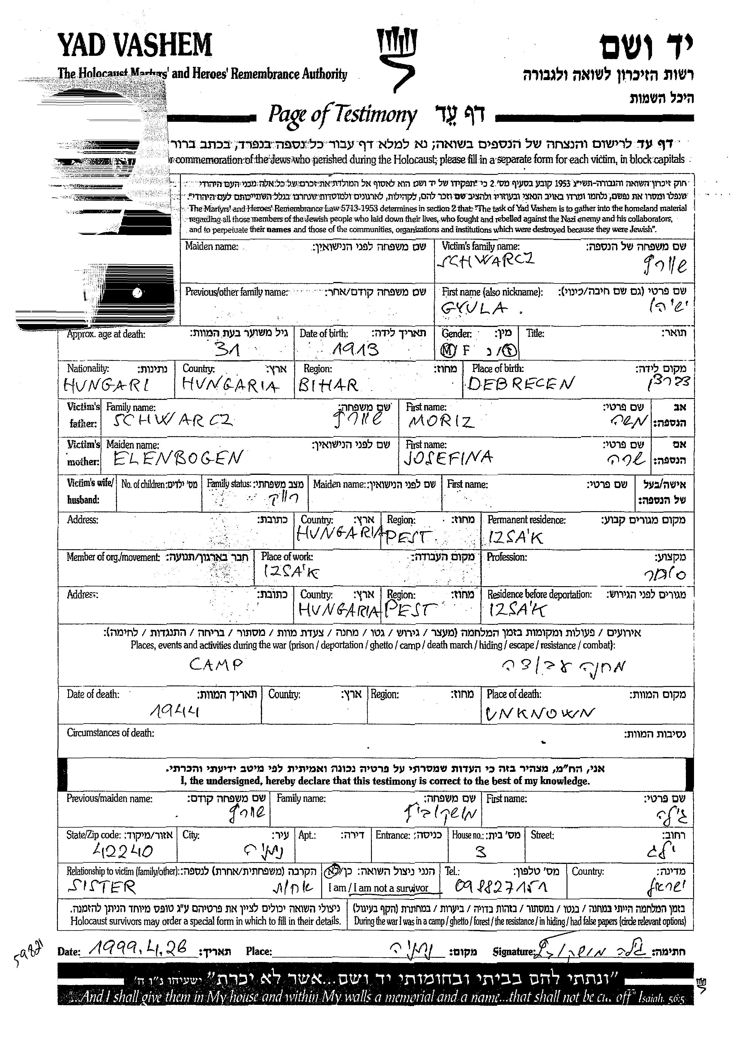 Gyula Ieshaiahu Schwarcz wurde im Jahr 1913 in Debrecen, Ungarn geboren. Er war der Sohn von Moriz Moshe und Josefina Sara. Er war Kaufmann/-frau und Ledig. Vor dem Zweiten Weltkrieg lebte er in Izsak, Ungarn. Während des Krieges war er in Izsak, Ungarn.