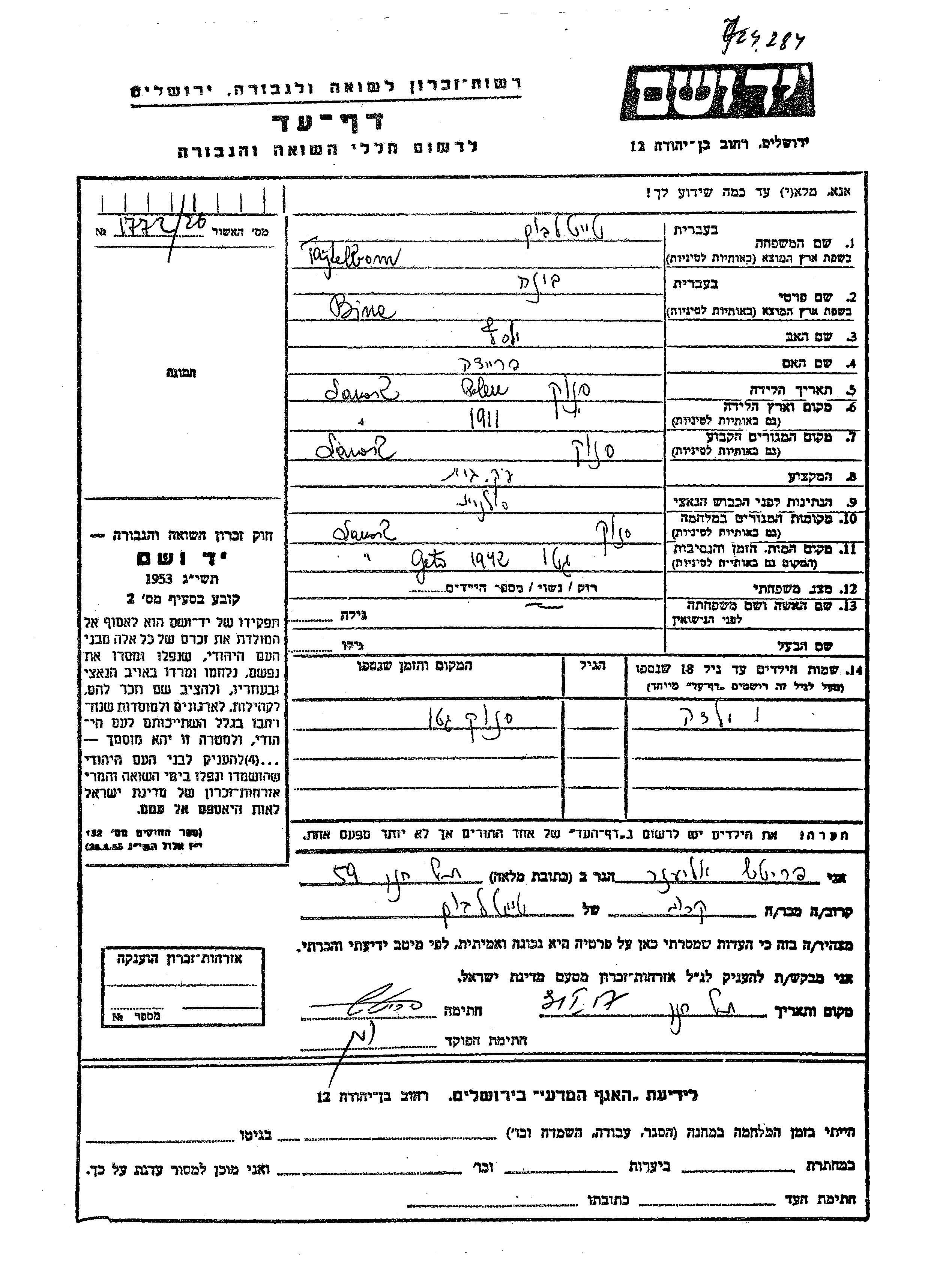 Tajtelbom Bina 1911 Sanok, Polen Gedenkblatt