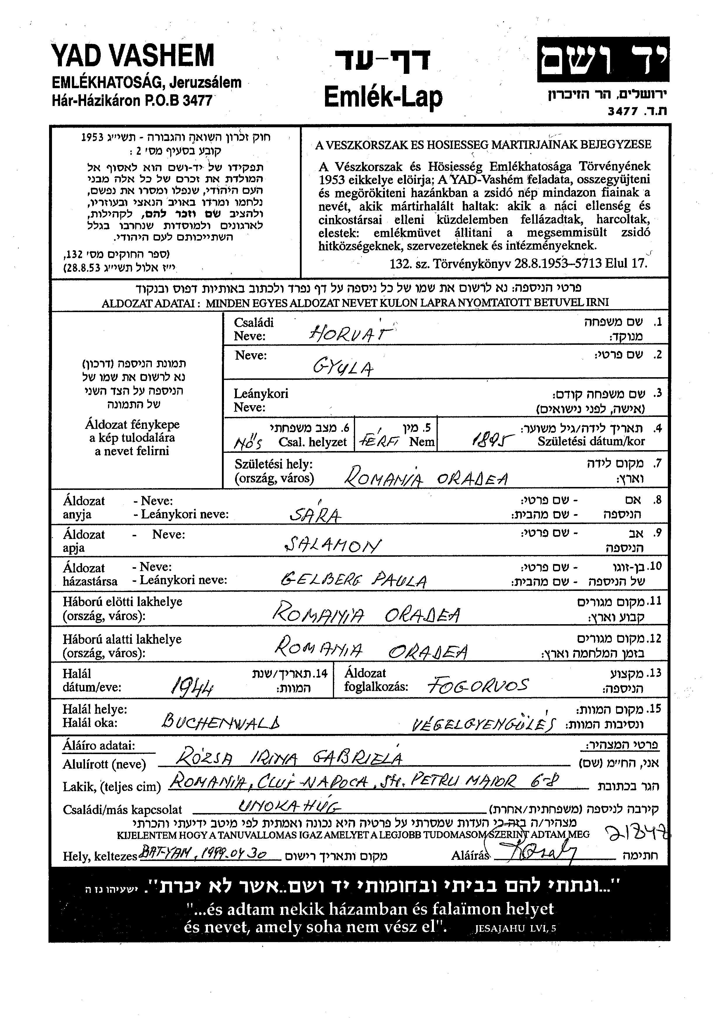 Gyula Horvat wurde im Jahr 1895 in Oradea, Rumänien geboren. Er war der Sohn von Salamon und Sara. Er war Zahnarzt/-ärztin und mit Paula, geb. Gelberg Verheiratet. Vor dem Zweiten Weltkrieg lebte er in Oradea, Rumänien. Während des Krieges war er in Oradea, Rumänien.