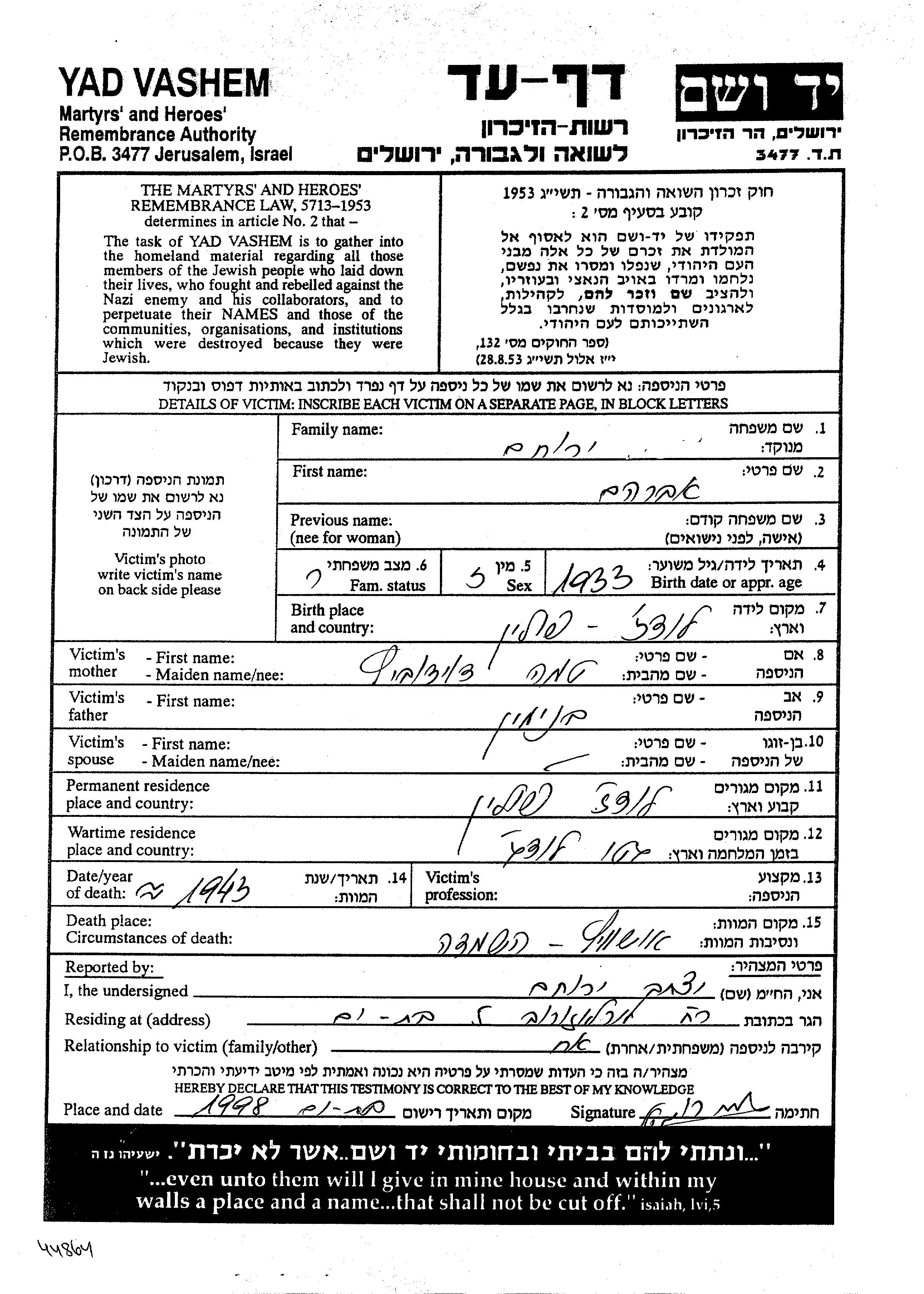 Avraham wurde in der Schoah ermordet. Todesort: Auschwitz, Polen im Jahr 1943.