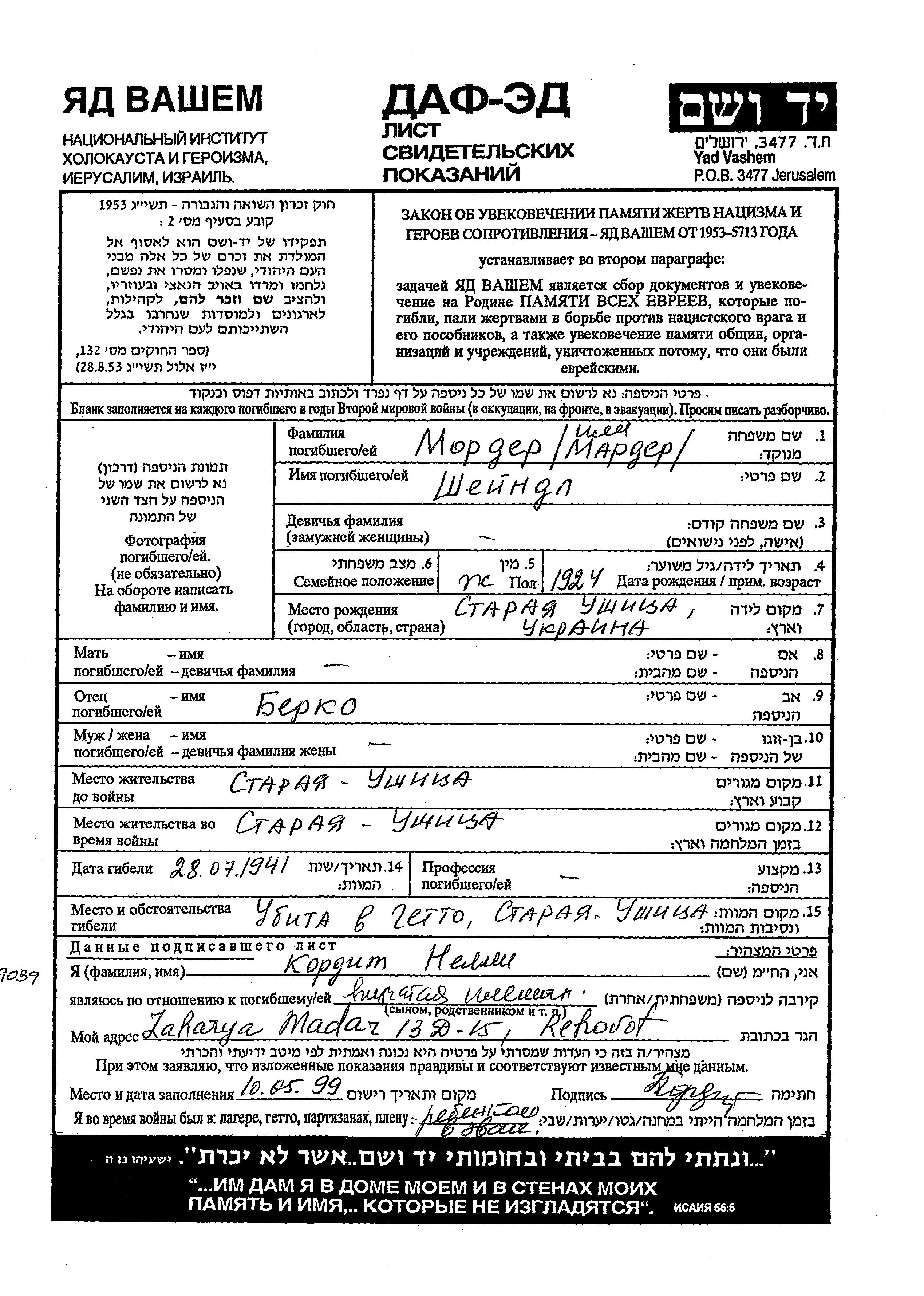 Sheindl Morderer Marder wurde im Jahr 1924 in Staraya Ushitsa, Ukraine (UdSSR) geboren. Sie war die Tochter von Berko. Sie war Ledig. Vor dem Zweiten Weltkrieg lebte sie in Staraya Ushitsa, Ukraine (UdSSR). Während des Krieges war sie in Staraya Ushitsa, Ukraine (UdSSR).