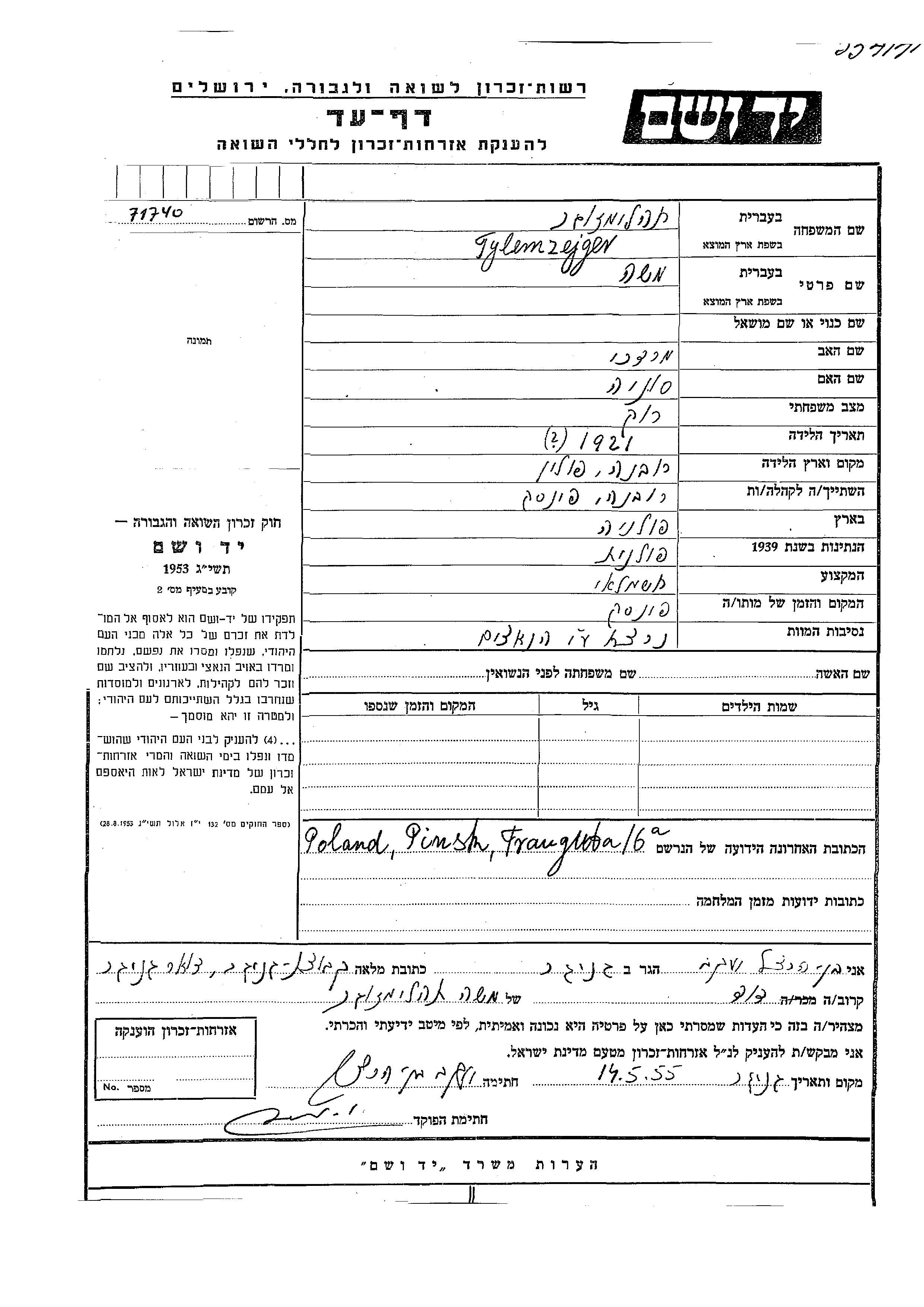 Moshe Tylemzejger wurde im Jahr 1921 in Rowno, Polen geboren. Er war der Sohn von Mordekhai und Sonia. Er war Elektriker/-in und Ledig. Vor dem Zweiten Weltkrieg lebte er in Rowno, Polen. Während des Krieges war er in Pinsk, Polen.