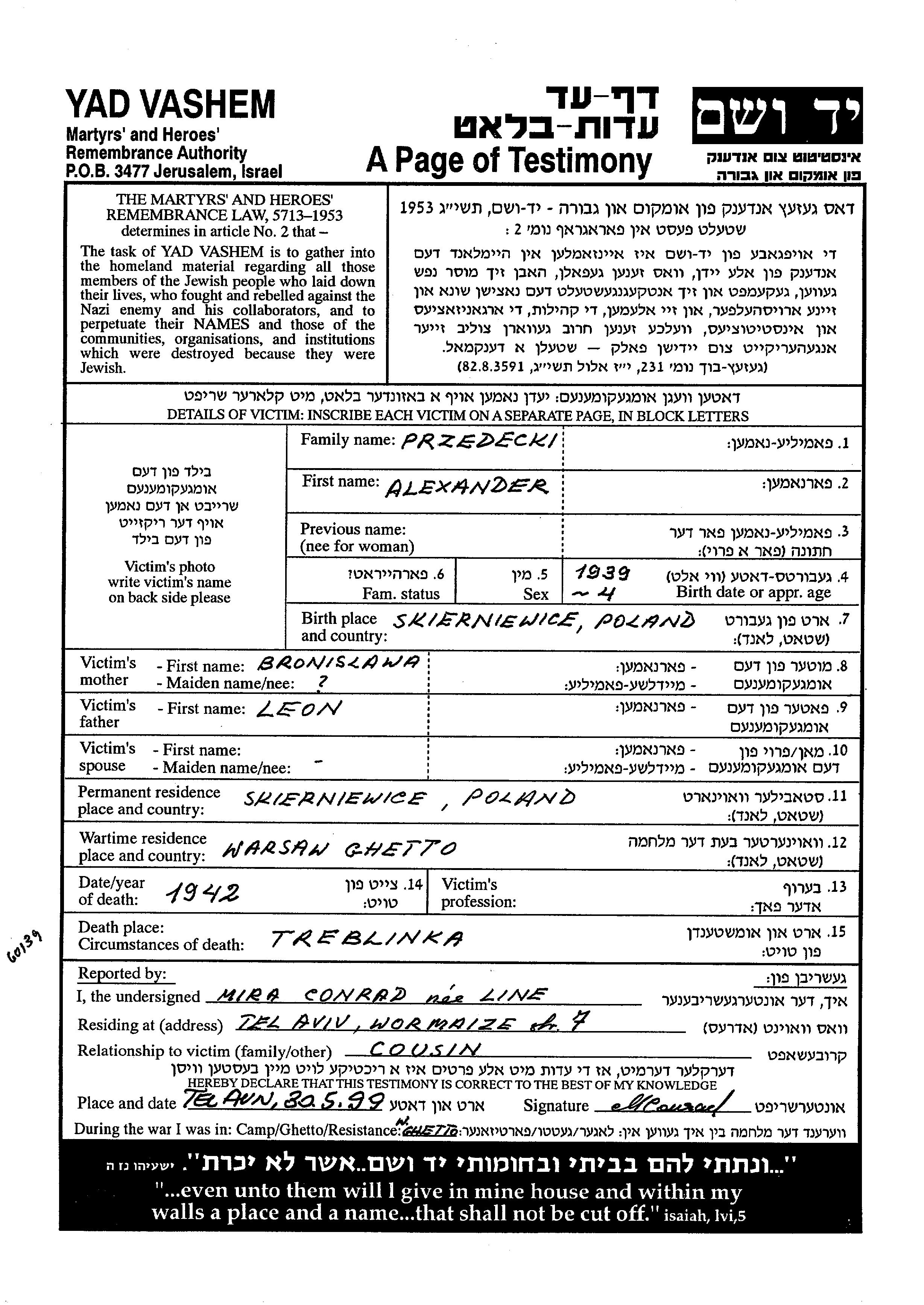 Alexander wurde in der Schoah ermordet. Todesort: Treblinka, Polen im Jahr 1942.