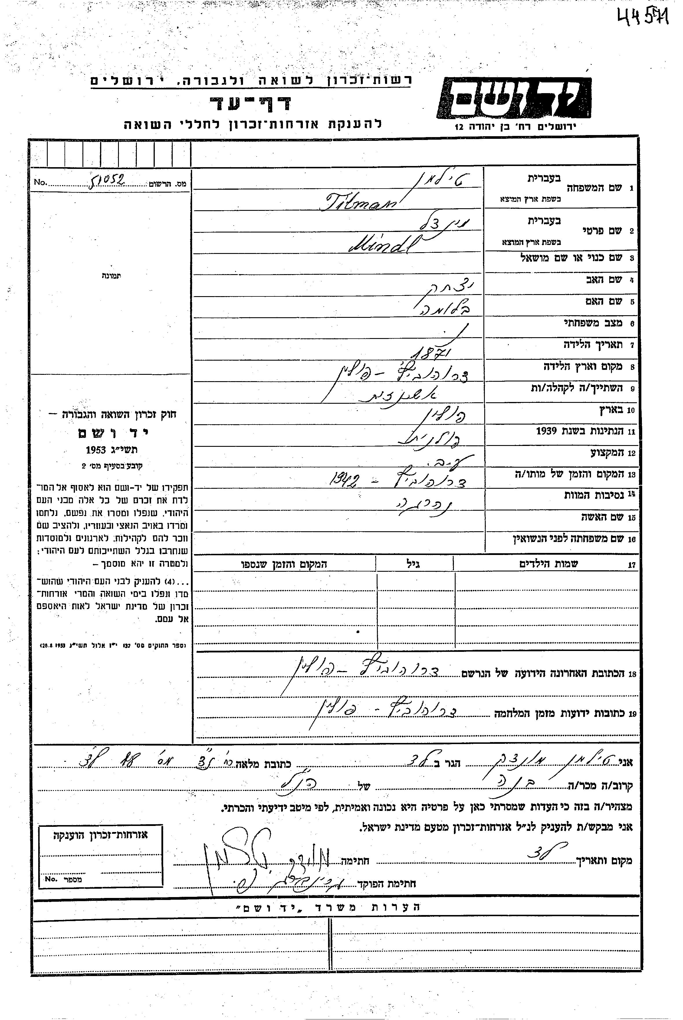 Mindl Tilman wurde im Jahr 1871 in Drohobycz, Polen geboren. Sie war die Tochter von Yitzkhak und Bluma. Sie war Hausfrau und Verheiratet. Vor dem Zweiten Weltkrieg lebte sie in Drohobycz, Polen. Während des Krieges war sie in Drohobycz, Polen.