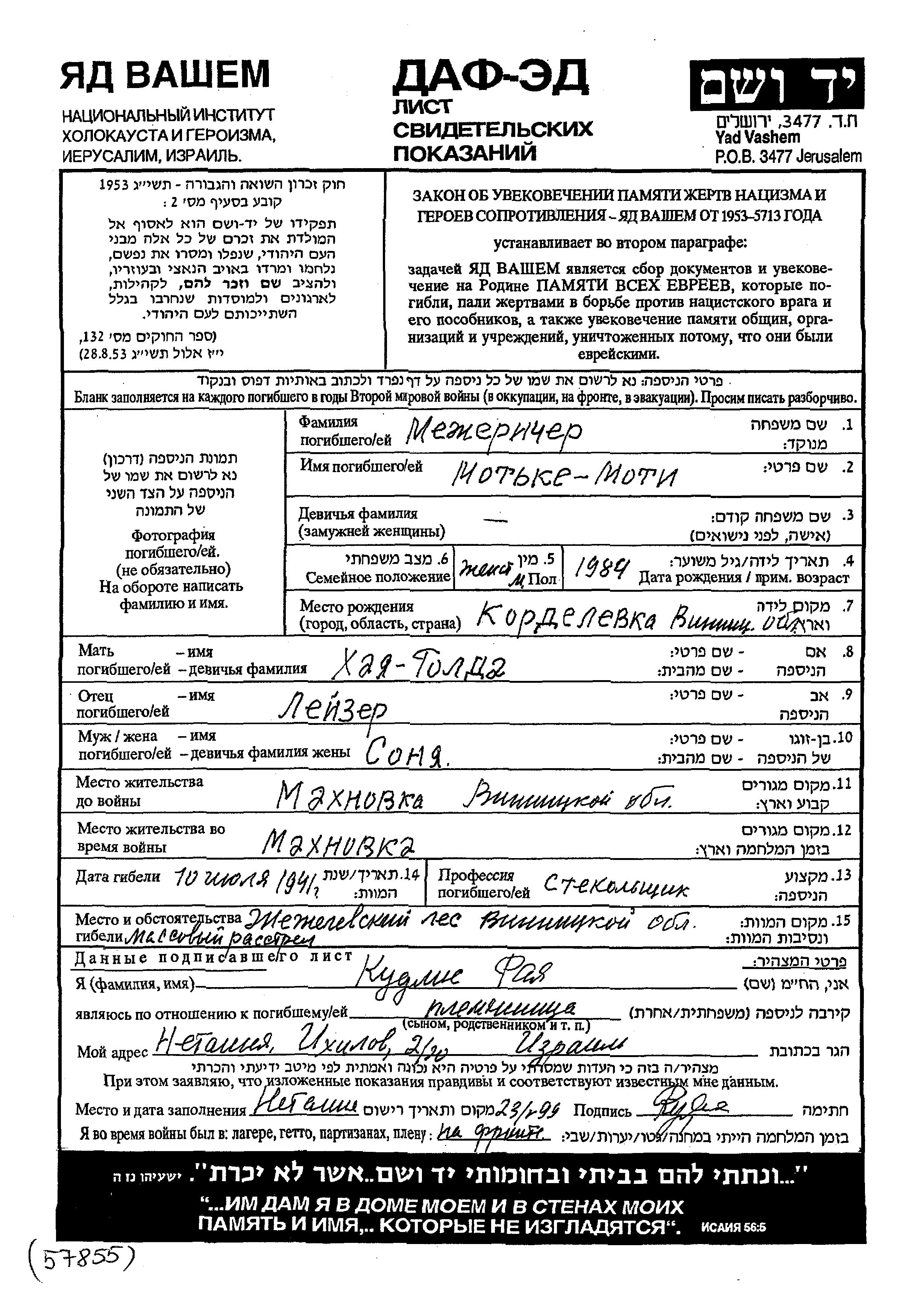 Motke wurde in der Schoah ermordet. Todesort: Zhezhelev, Ukraine (UdSSR) im Jahr 10/07/1941.