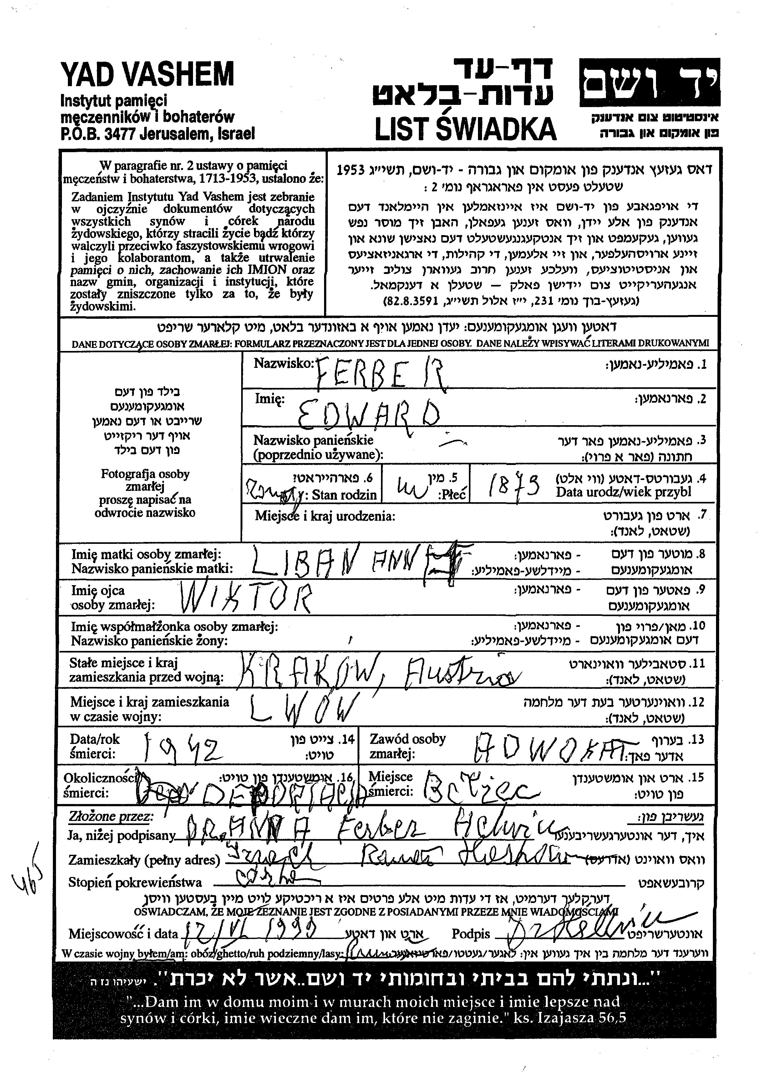 Edward wurde in der Schoah ermordet. Todesort: Belzec, Polen im Jahr 1942.