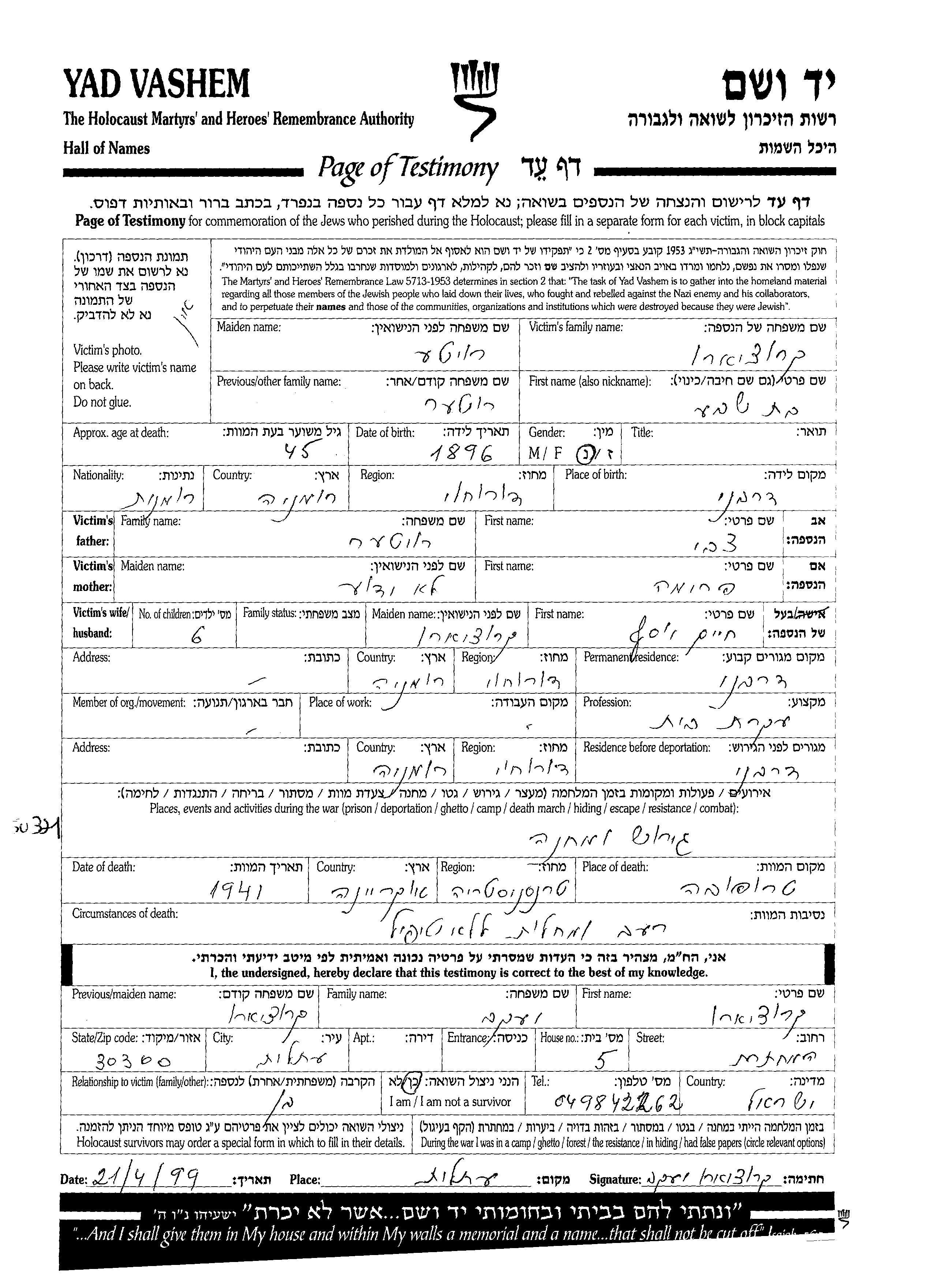 Batsheva Kruchiaro, geb. Roiter wurde im Jahr 1896 in Darabani, Rumänien geboren. Sie war die Tochter von Tzvi und Frima. Sie war Hausfrau und mit Khaim Yosef Verheiratet. Vor dem Zweiten Weltkrieg lebte sie in Darabani, Rumänien. Während des Krieges war sie in Darabani, Rumänien.