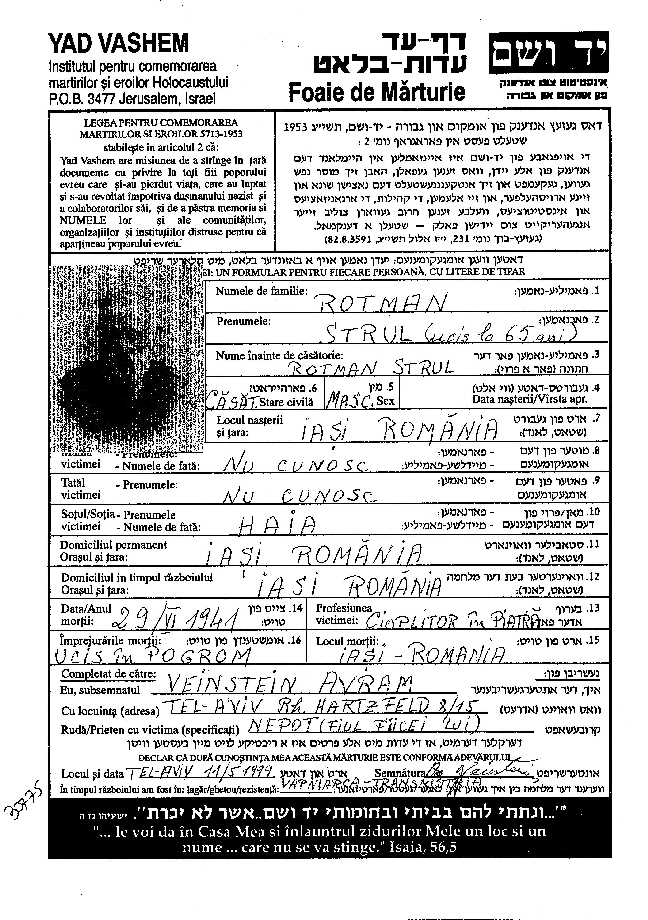 Strul wurde in der Schoah ermordet. Todesort: Iasi, Rumänien im Jahr 29/06/1941.