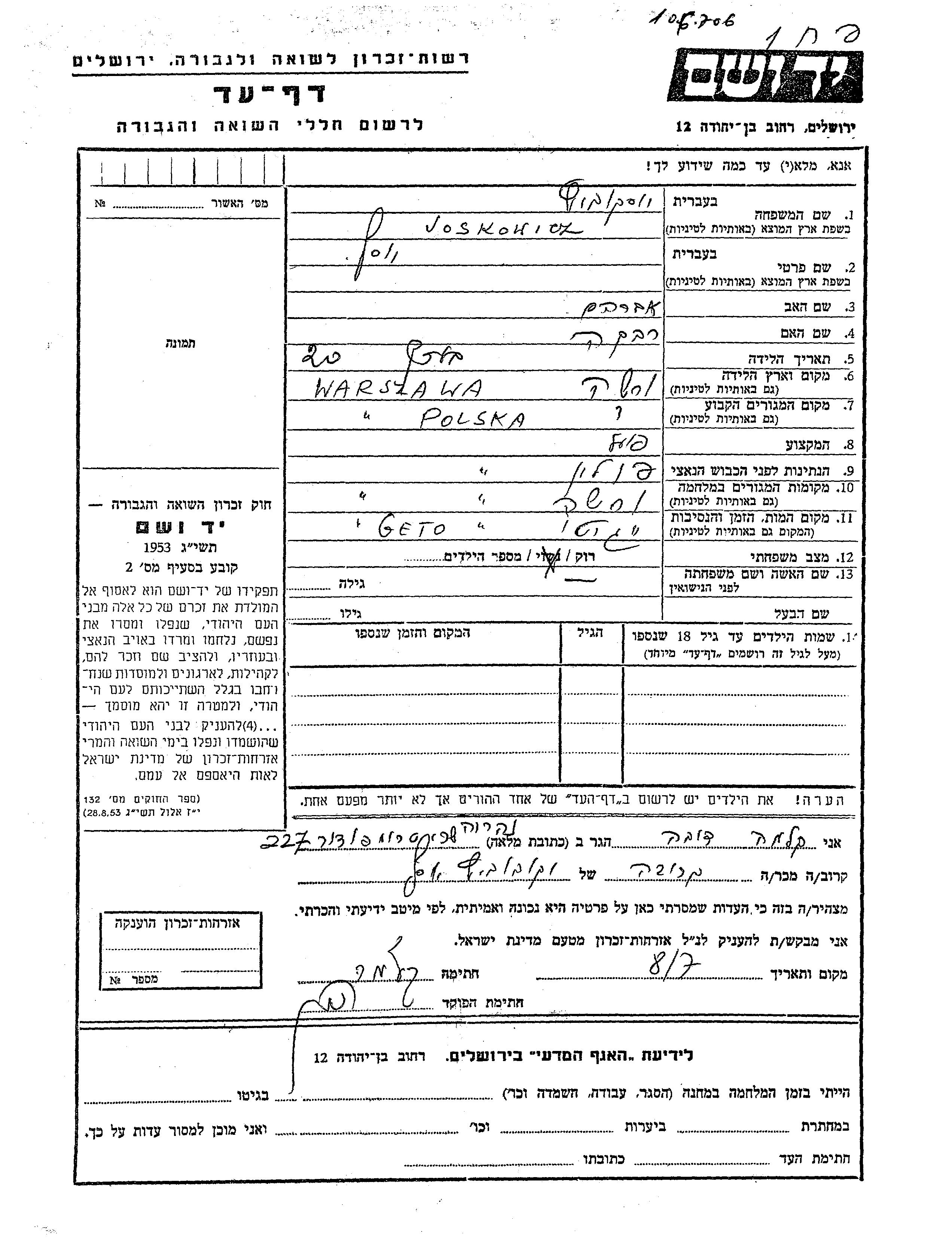 Joskowicz Yosef Warszawa, Polen Gedenkblatt