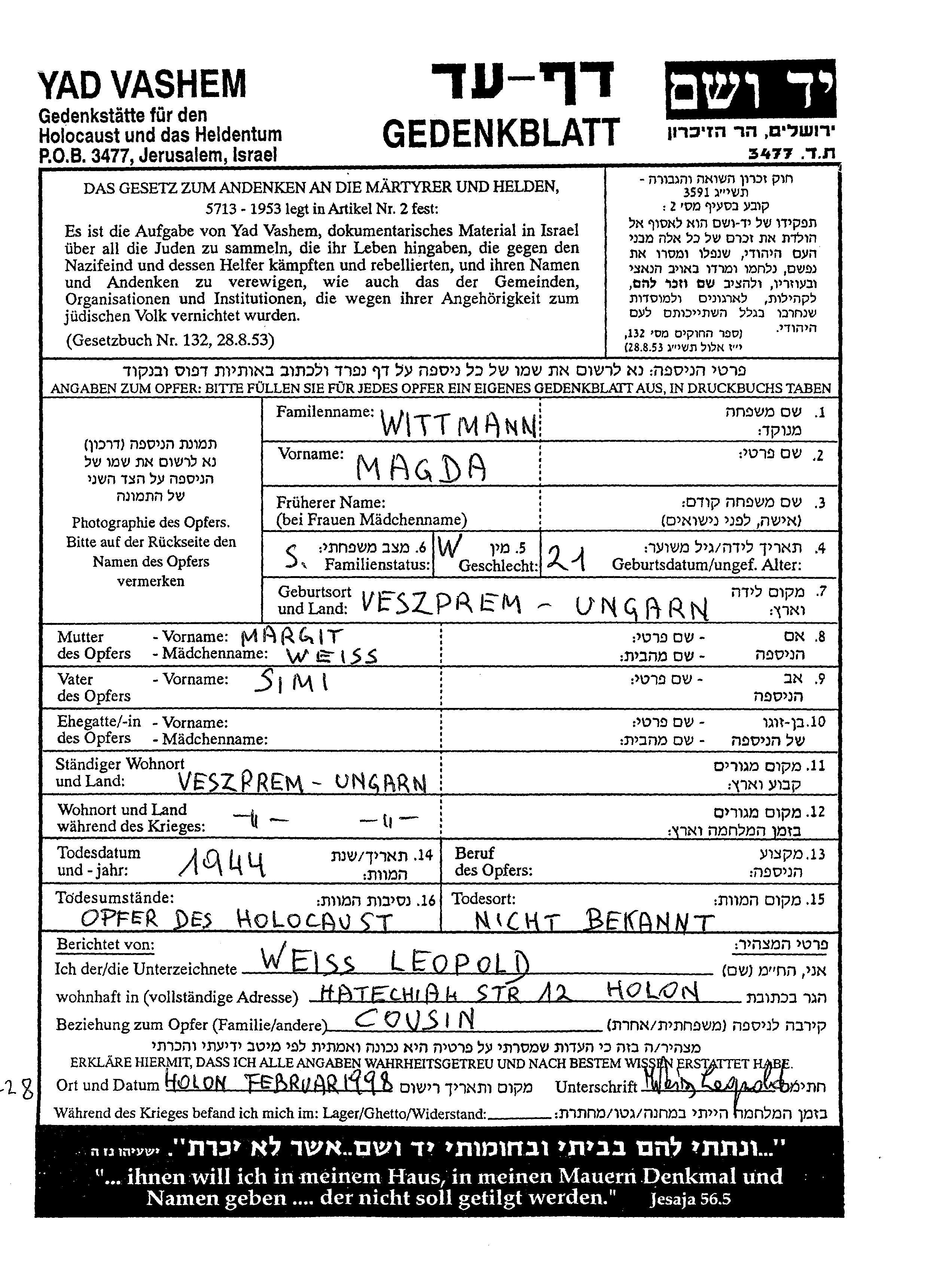 Suche nach einem Todesjahr im Zeitraum der Holocaust: 1933 bis 1945. Bitte wählen Sie 'Exakt' im Auswahlmenü, um nur nach einem einzelnen Jahr zu suchen, alternativ können Sie die flexibleren Optionen '+/- 2 Jahre' oder '+/- 5 Jahre' wählen.
