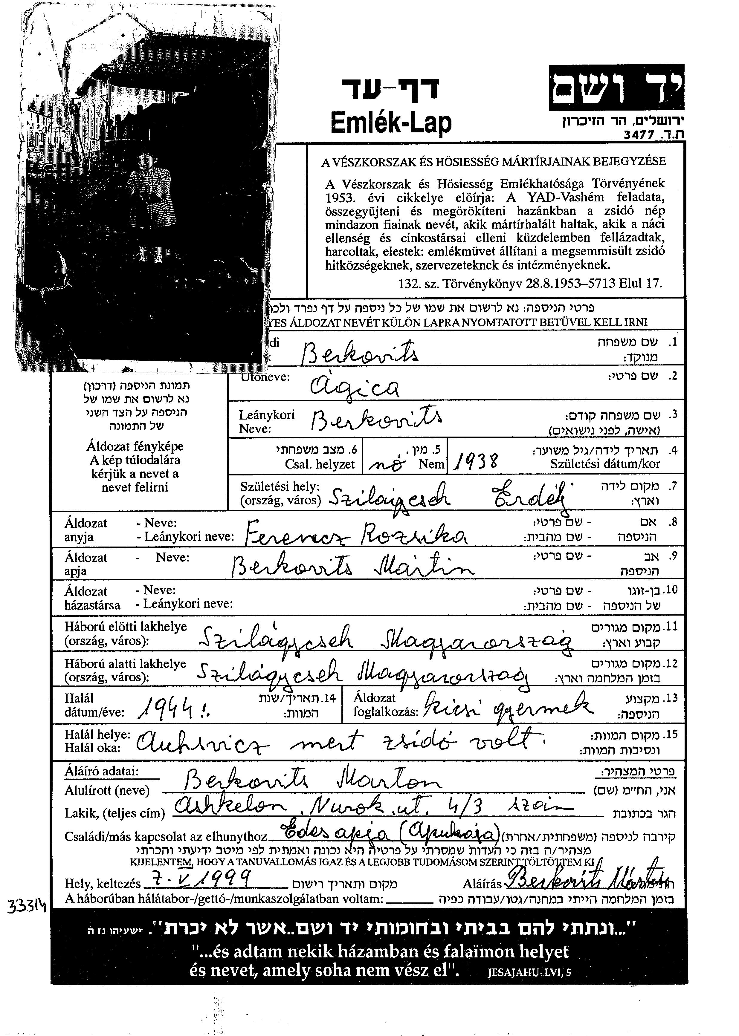 Berkovits Agnes 1938 Szilagycseh, Rumänien Gedenkblatt