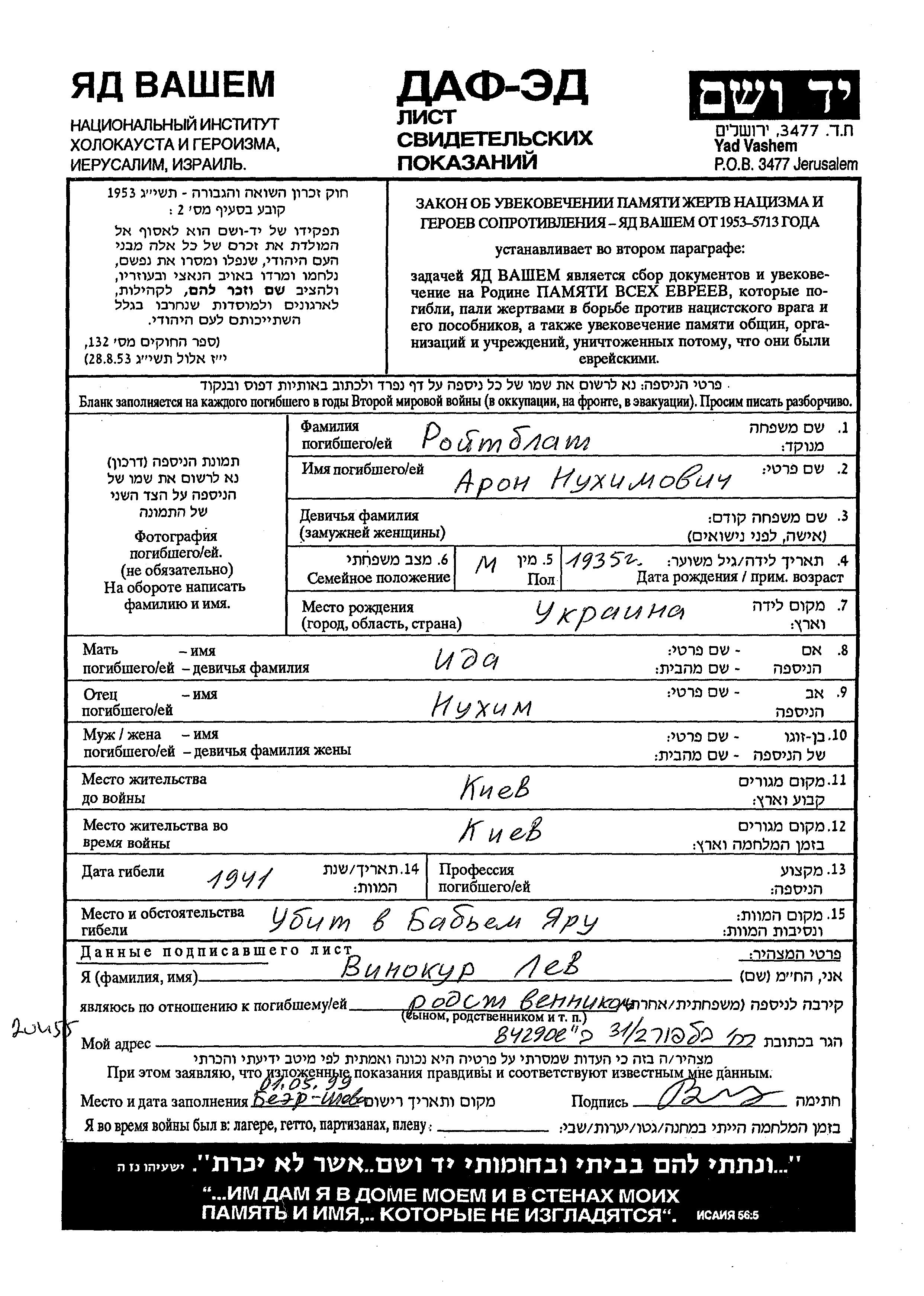 Aron wurde in der Schoah ermordet. Todesort: Babi Yar, Ukraine (UdSSR) im Jahr 1941.