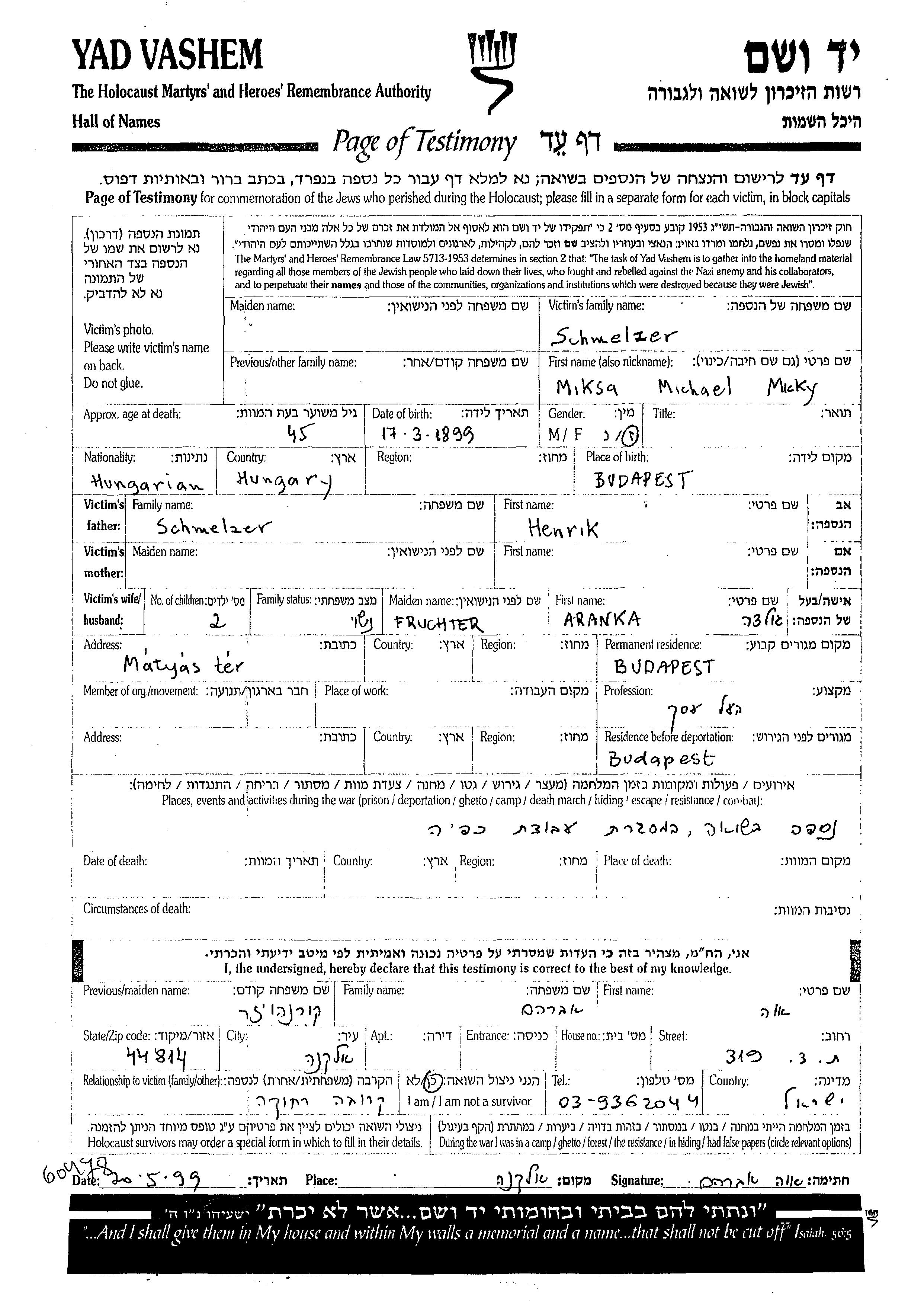 Miska Schmelzer wurde im Jahr 1899 in Budapest, Ungarn geboren. Er war der Sohn von Henrik. Er war Geschäftsinhaber/-in und mit Aranka Golda, geb. Fruchter Verheiratet. Vor dem Zweiten Weltkrieg lebte er in Budapest, Ungarn. Während des Krieges war er in Budapest, Ungarn.