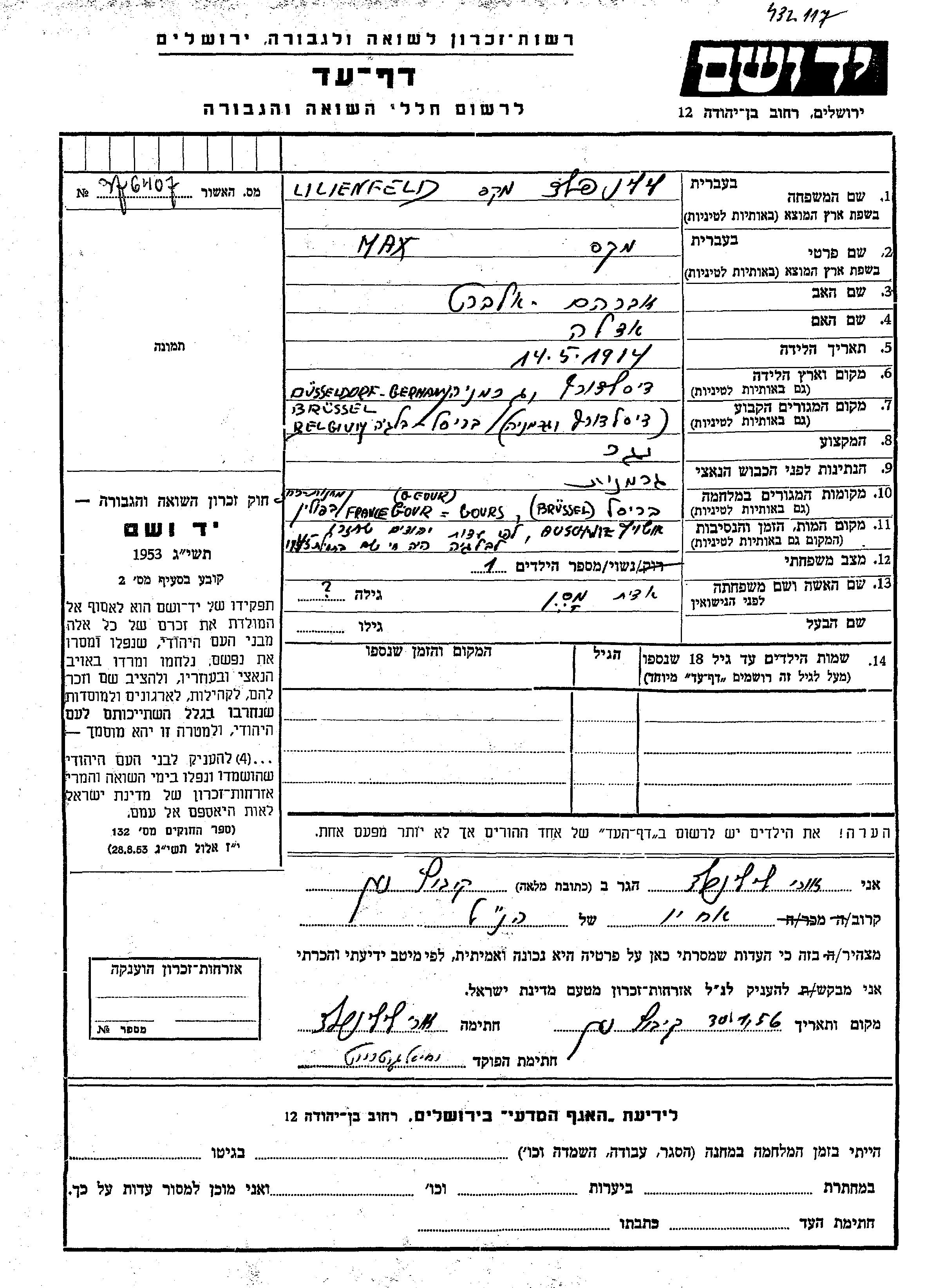 Max Lilinfeld wurde im Jahr 1914 in Dusseldorf, Deutsches Reich geboren. Er war der Sohn von Avraham Albert und Adela. Er war Zimmermann und mit Edit, geb. Meshen Verheiratet. Vor dem Zweiten Weltkrieg lebte er in Bruxelles, Belgien. Während des Krieges war er in Bruxelles, Belgien.