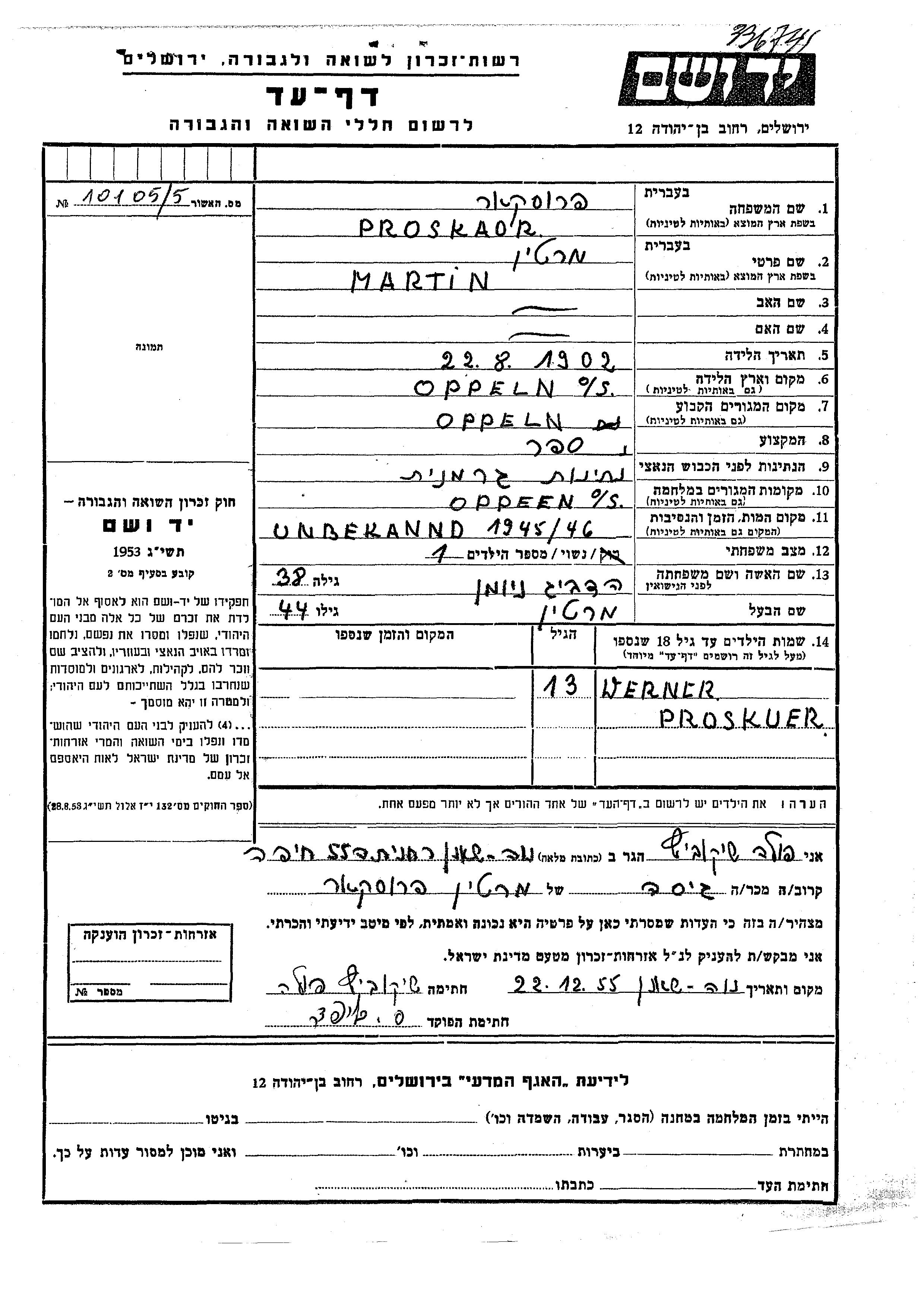 Martin Proskaor wurde im Jahr 1902 in Oppeln, Deutsches Reich geboren. Er war Friseur/-in und mit Hedvig, geb. Noiman Verheiratet. Vor dem Zweiten Weltkrieg lebte er in Oppeln, Deutsches Reich. Während des Krieges war er in Oppeln, Deutsches Reich.