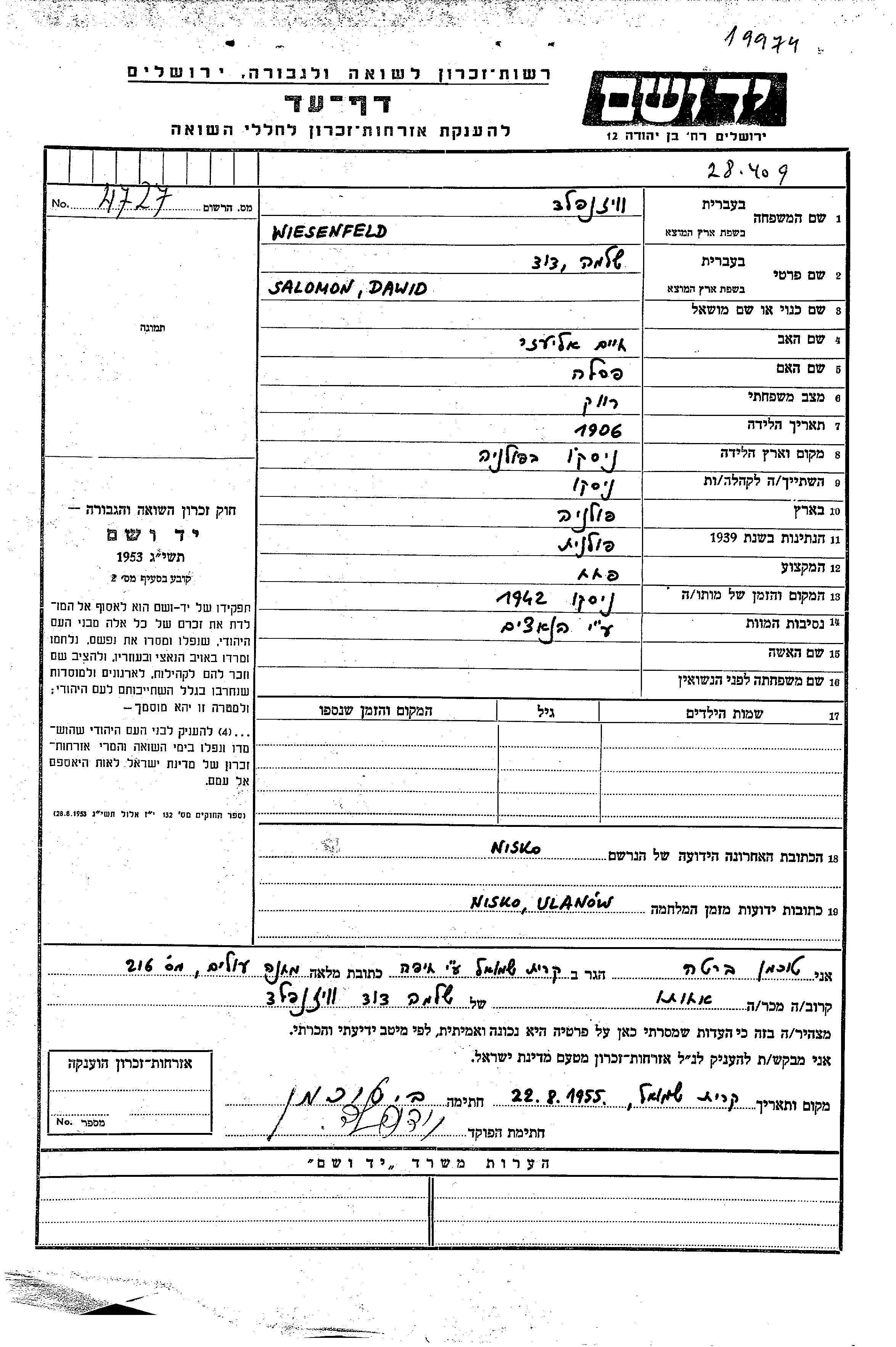 Salomon Dawid Wiesenfeld wurde im Jahr 1906 in Nisko, Polen geboren. Er war der Sohn von Khaim Eliezer und Pesla. Er war Blechschmied und Ledig. Vor dem Zweiten Weltkrieg lebte er in Nisko, Polen. Während des Krieges war er in Nisko, Polen.