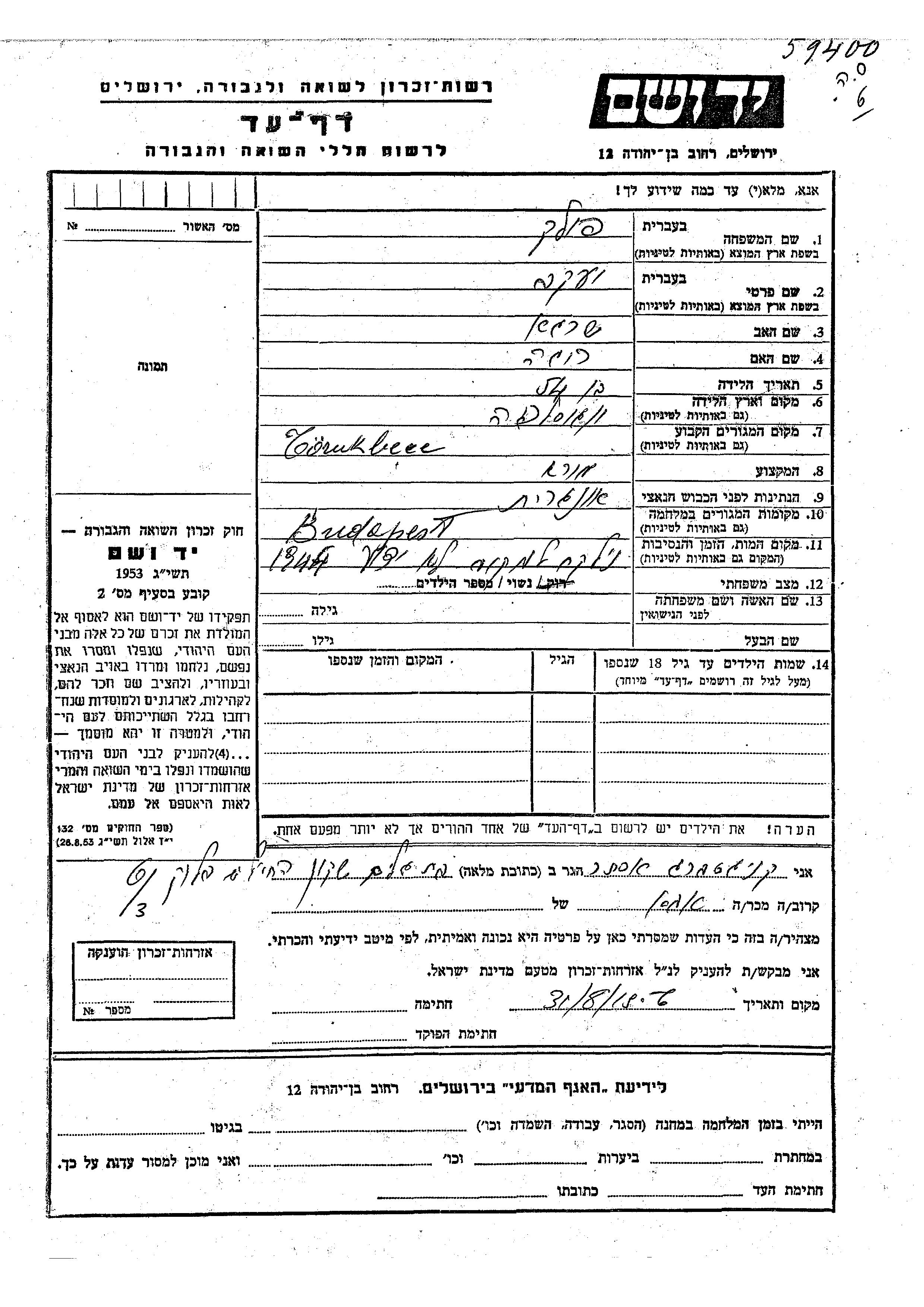 Yaakov wurde in der Schoah ermordet. Todesort: unbekannt im Jahr 1944.