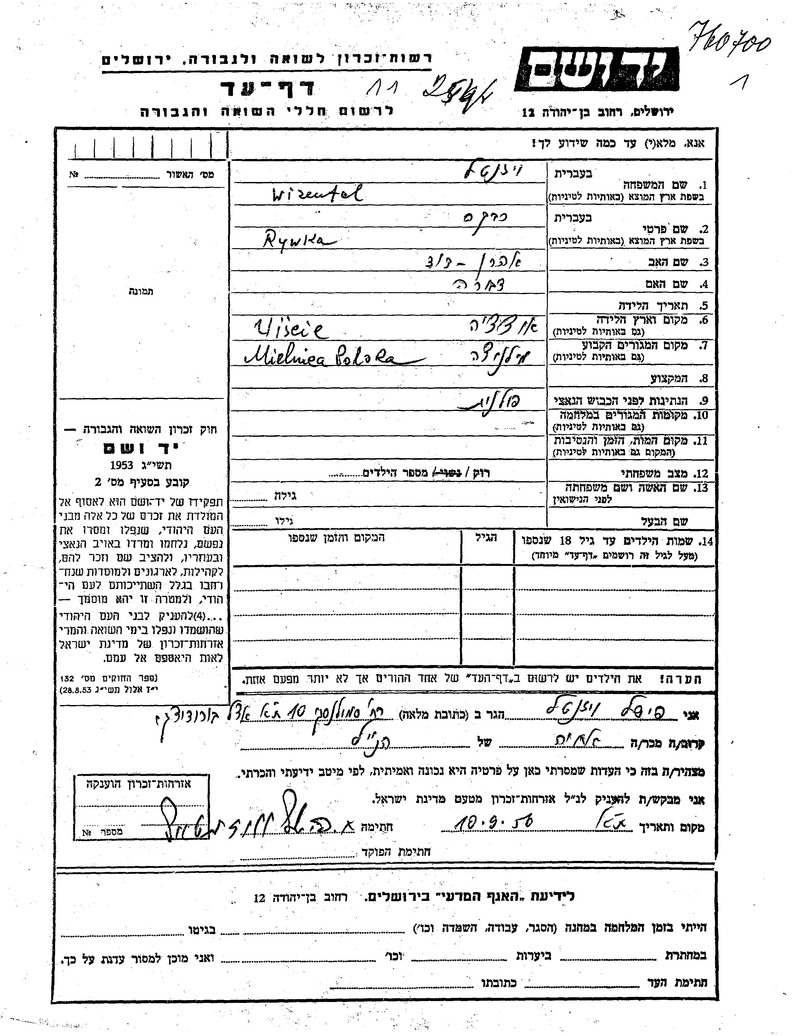 Rywka Wizental wurde in Uscie Biskupie, Polen geboren. Sie war die Tochter von Aharon David und Dvora. Sie war Ledig. Vor dem Zweiten Weltkrieg lebte sie in Mielnica, Polen.