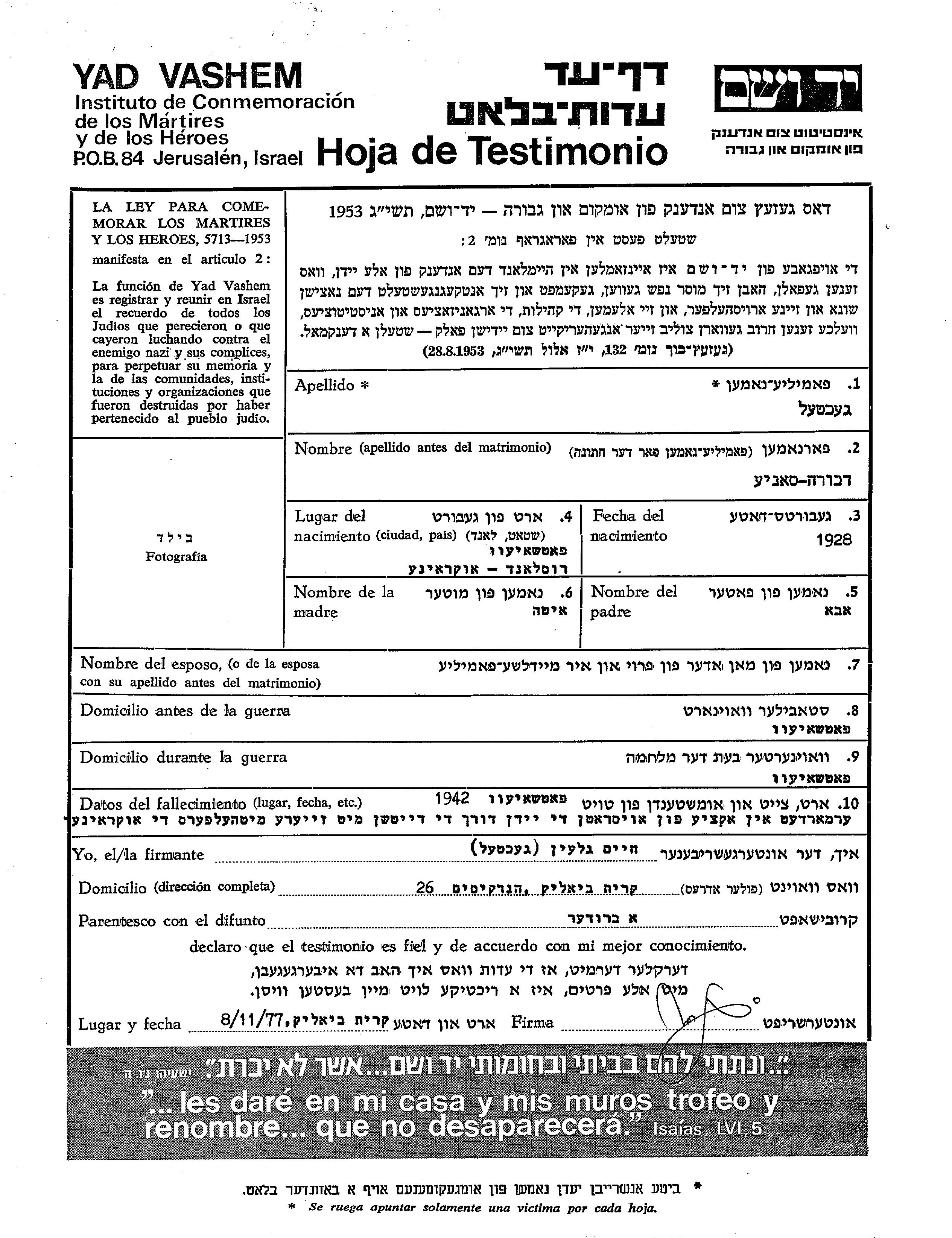 Gekhtel Dvora Sonie 1928 Pochaiv, Polen Gedenkblatt