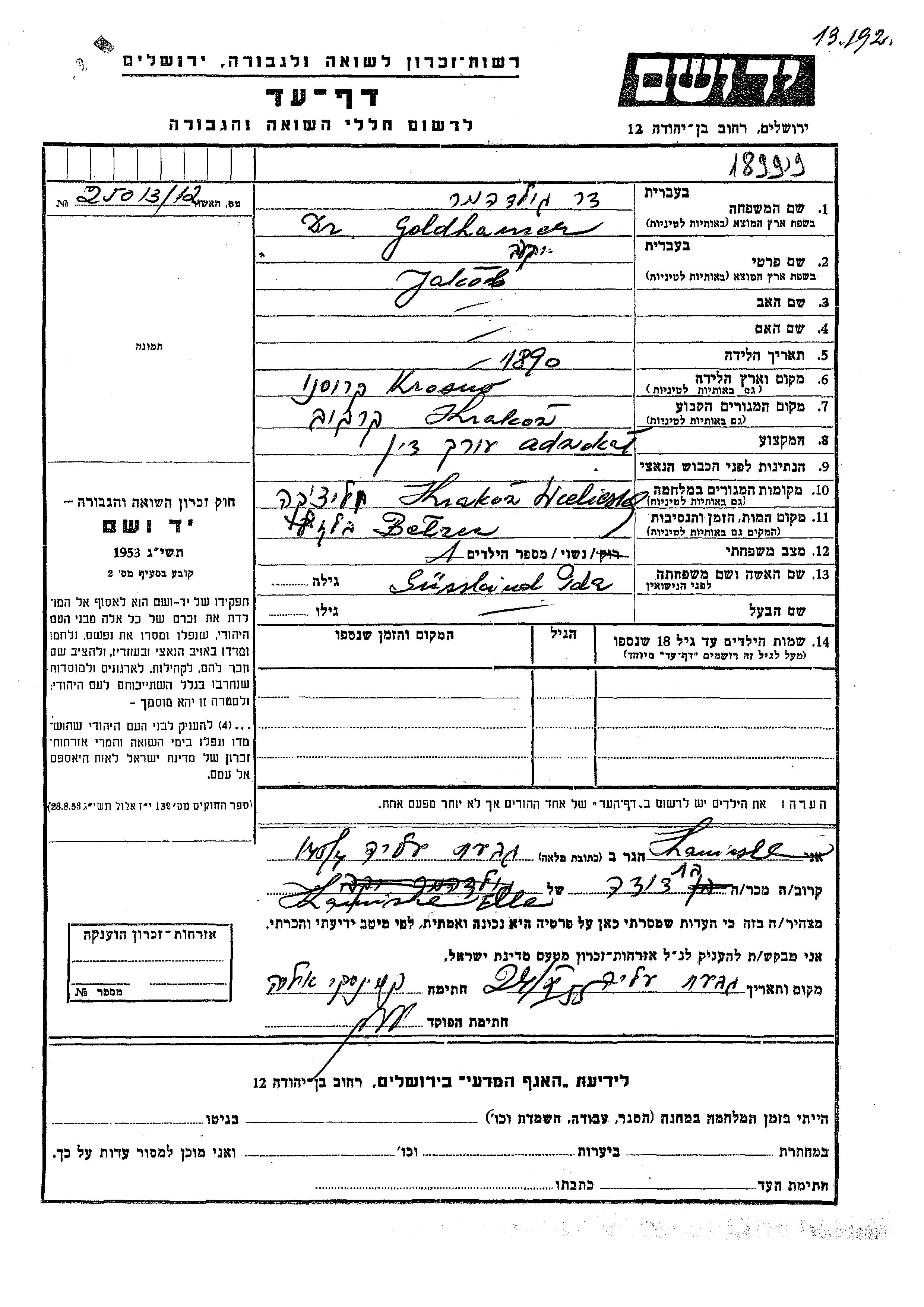 Dr. Jakob Goldhamer wurde im Jahr 1890 in Krosno, Polen geboren. Er war Rechtsanwalt/rechtsanwältin und mit Ida, geb. Süsskind Verheiratet. Vor dem Zweiten Weltkrieg lebte er in Krakow, Polen. Während des Krieges war er in Welicka, Polen.
