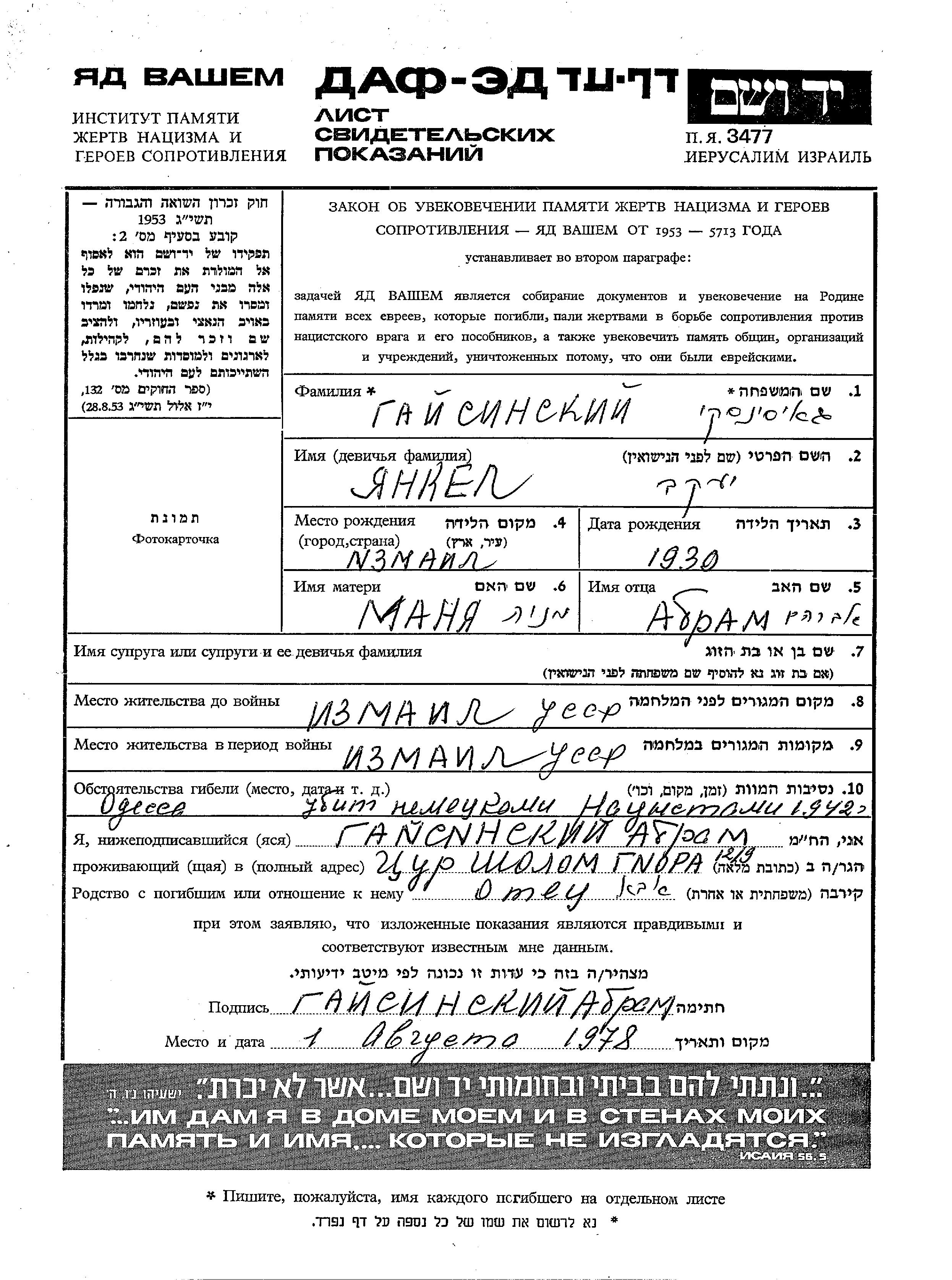 Yankel Gaisinski wurde im Jahr 1930 in Izmail, Rumänien geboren. Er war der Sohn von Abram und Manya. Er war Ledig. Vor dem Zweiten Weltkrieg lebte er in Izmail, Rumänien. Während des Krieges war er in Izmail, Rumänien.