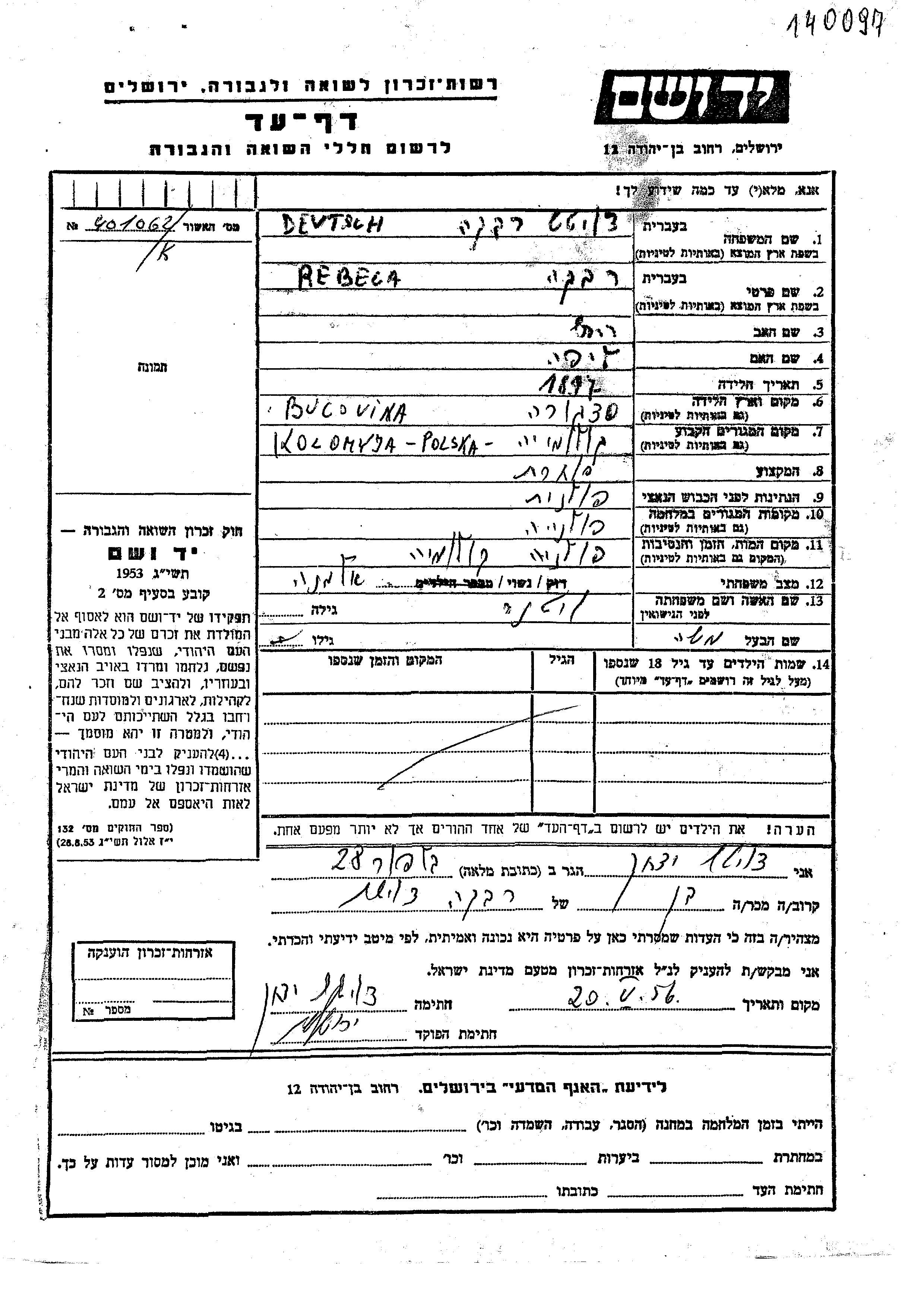 Rebeca Deutsch, geb. Litner wurde im Jahr 1897 in Sadigora, Rumänien geboren. Sie war die Tochter von Lipa und Rakhel. Sie war Kaufmann/-frau und mit Moshe Witwe. Vor dem Zweiten Weltkrieg lebte sie in Kolomyja, Polen. Während des Krieges war sie in Polen.