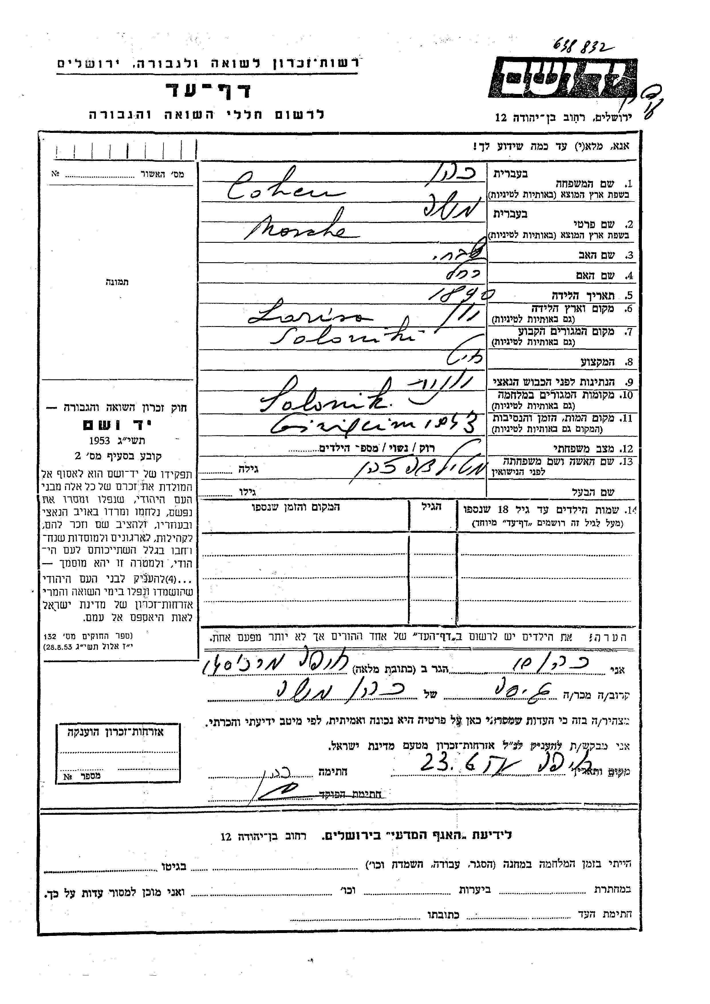 Mosche Cohen wurde im Jahr 1890 in Larissa, Griechenland geboren. Er war der Sohn von Shabtai und Rakhel. Er war Schneider und mit Matilda Verheiratet. Vor dem Zweiten Weltkrieg lebte er in Saloniki, Griechenland. Während des Krieges war er in Saloniki, Griechenland.