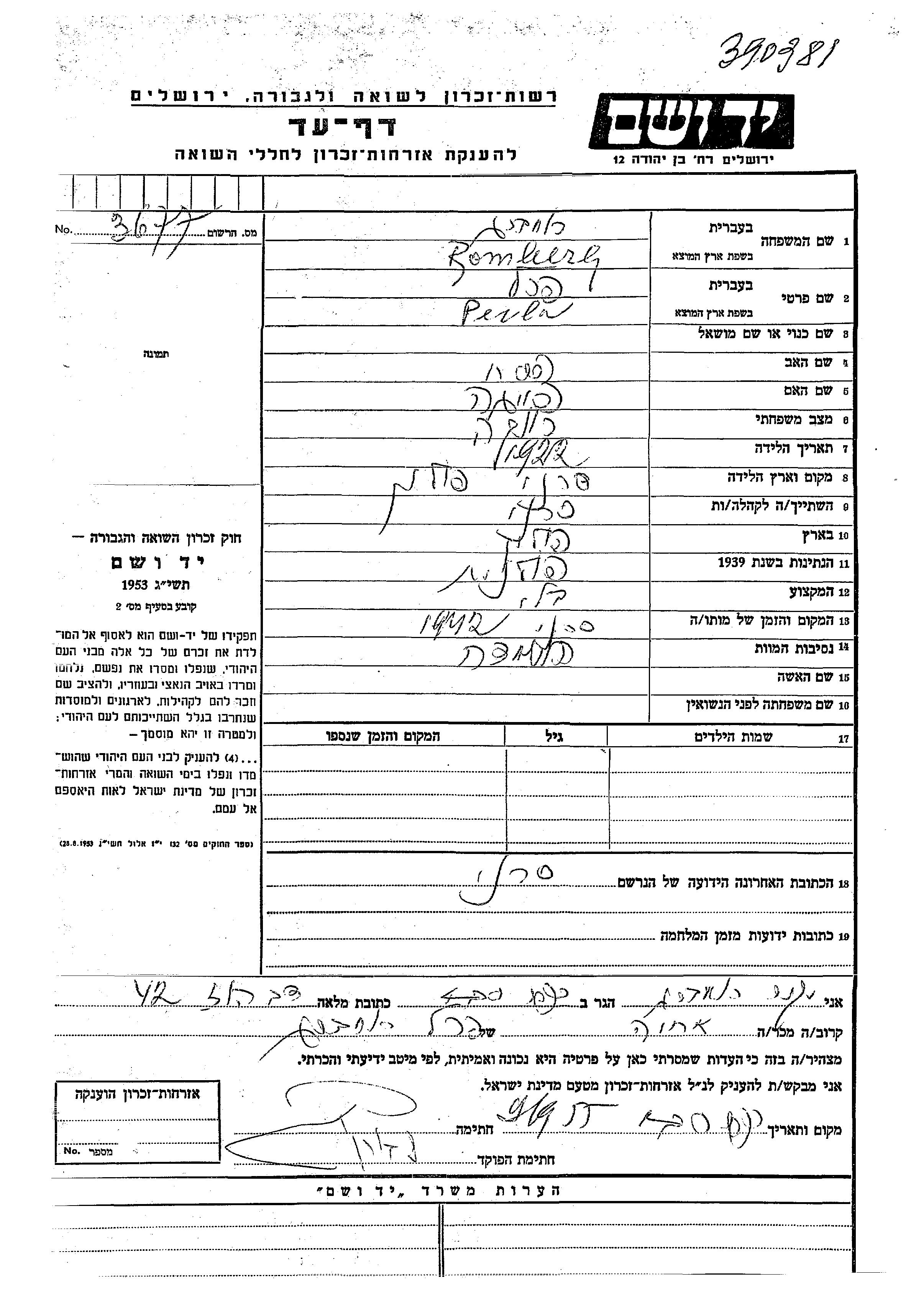 Perla Romberg wurde im Jahr 1922 in Sarny, Polen geboren. Sie war die Tochter von Pesakh und Feiga. Sie war Ledig. Vor dem Zweiten Weltkrieg lebte sie in Sarny, Polen. Während des Krieges war sie in Sarny, Polen.