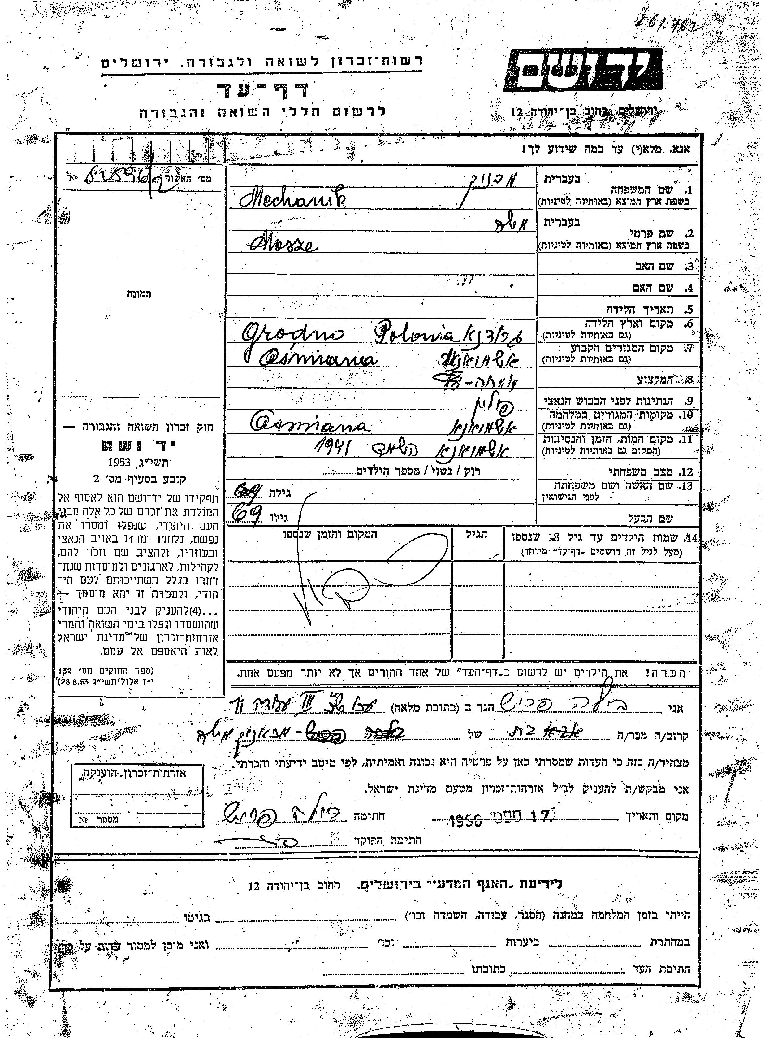 Mosze Mechanik wurde in Grodno, Polen geboren. Er war Holzexperte. Vor dem Zweiten Weltkrieg lebte er in Osmiana, Polen. Während des Krieges war er in Osmiana, Polen.