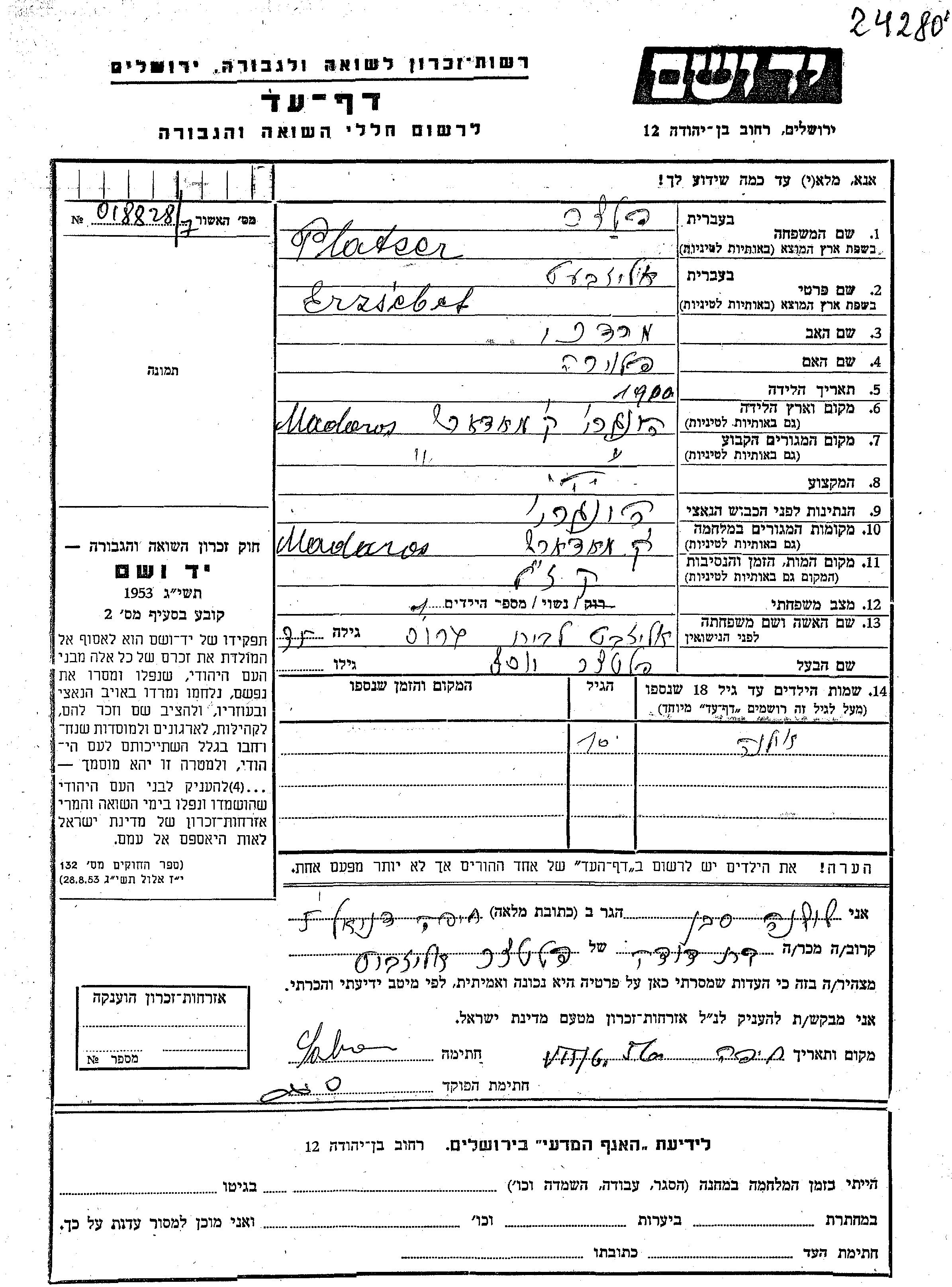 Erzsebet Platzer, geb. Gros wurde im Jahr 1900 in Madaros, Ungarn geboren. Sie war die Tochter von Mordekhai und Flor. Sie war mit Yosef Verheiratet. Vor dem Zweiten Weltkrieg lebte sie in Madaros, Ungarn. Während des Krieges war sie in Madaros, Ungarn.