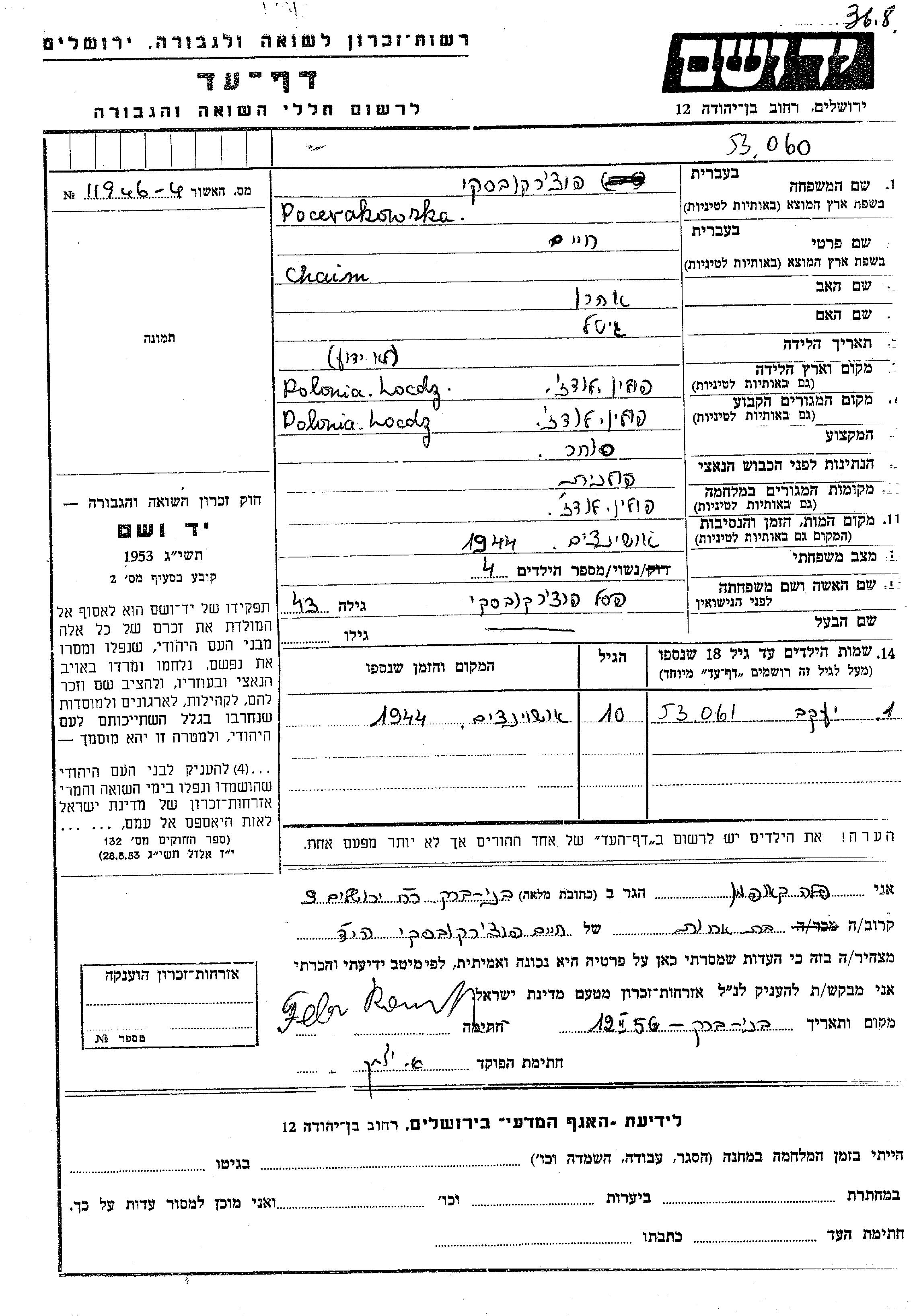 Chaim Pocerakowska wurde in Lodz, Polen geboren. Er war der Sohn von Aharon und Gitel. Er war Kaufmann/-frau und mit Pesel Verheiratet. Vor dem Zweiten Weltkrieg lebte er in Lodz, Polen. Während des Krieges war er in Lodz, Polen.