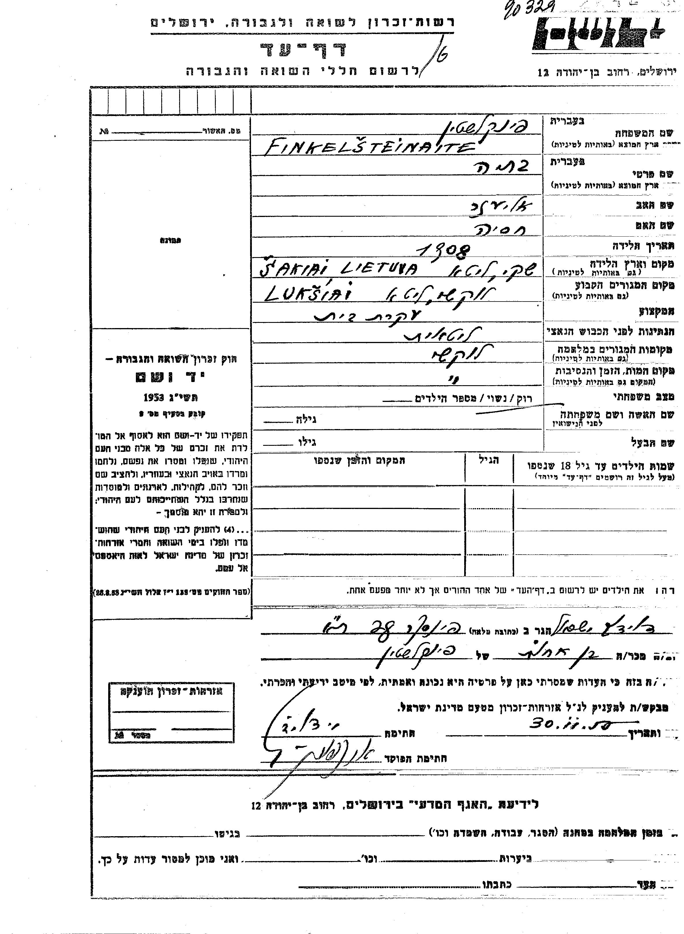 Finkelstein Batia 1908 Luksiai, Litauen Gedenkblatt