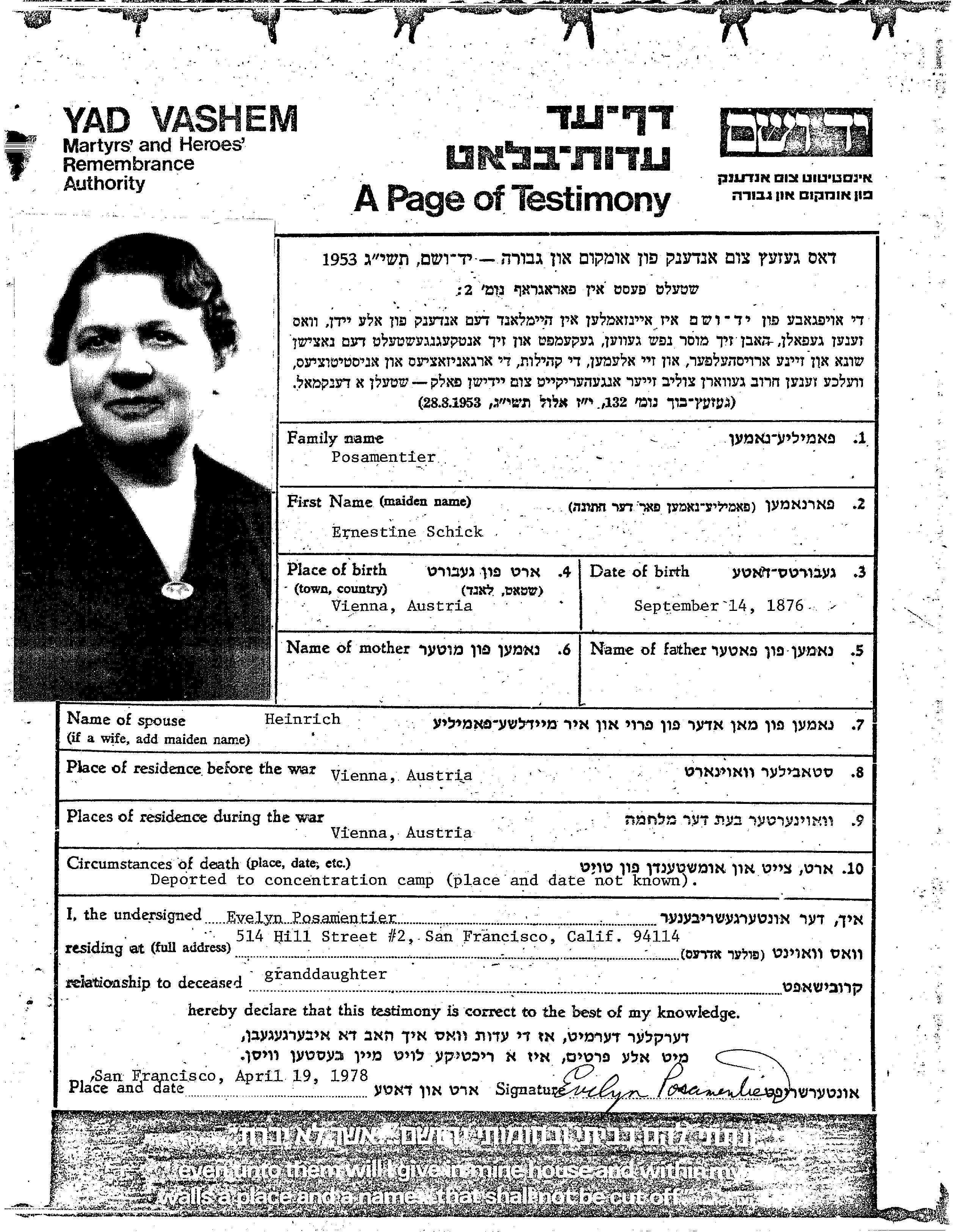 Ernestine Posamentier, geb. Schick wurde im Jahr 1876 in Wien, Österreich geboren. Sie war die Tochter von Joseph und Julie. Sie war mit Heinrich Verheiratet. Vor dem Zweiten Weltkrieg lebte sie in Wien, Österreich. Während des Krieges war sie in Minsk, Weißrussland (UdSSR).