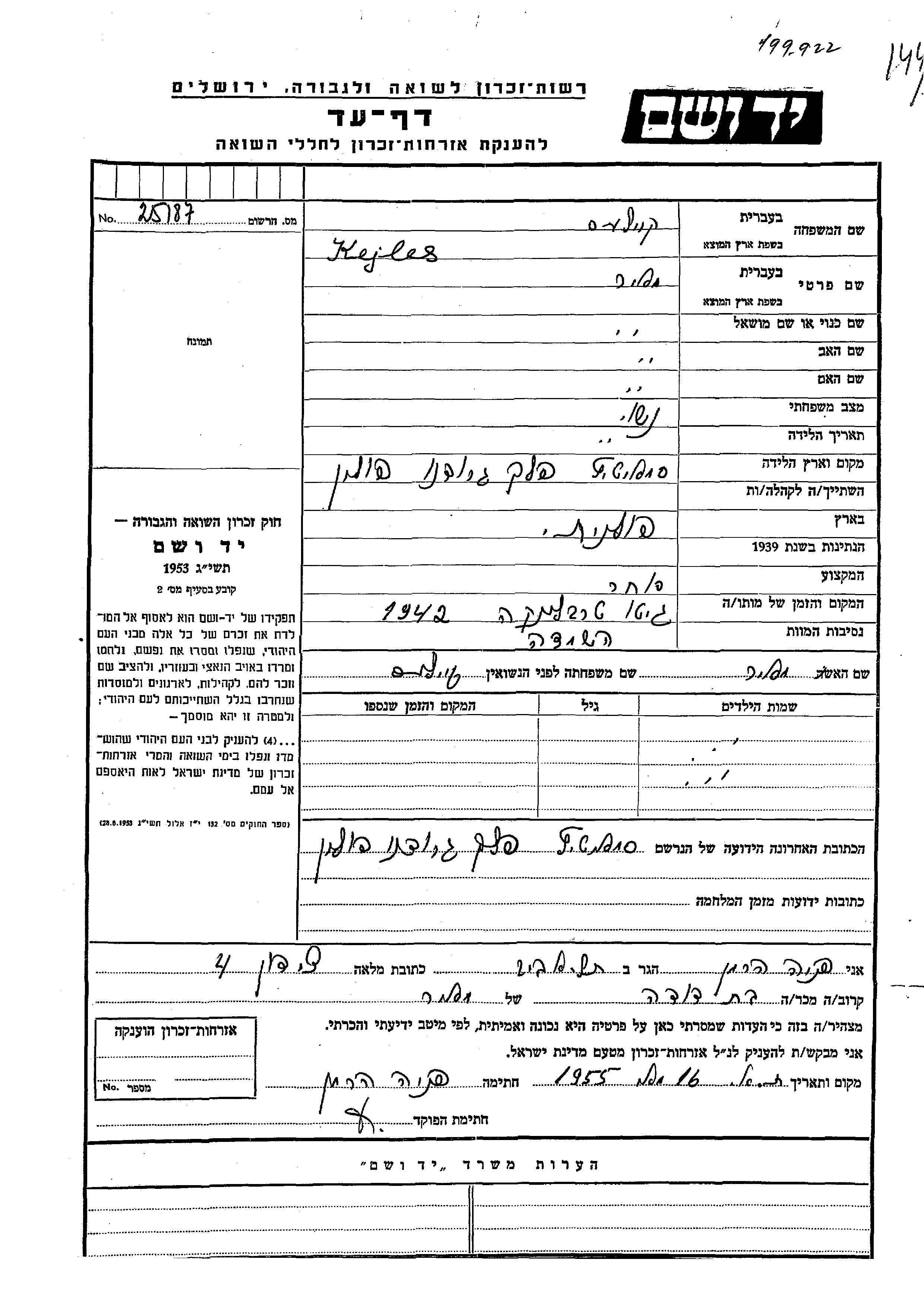 Meir Kejles wurde in Siemiatycze, Polen geboren. Er war Kaufmann/-frau und Verheiratet. Während des Krieges war er in Siemiatycze, Polen.