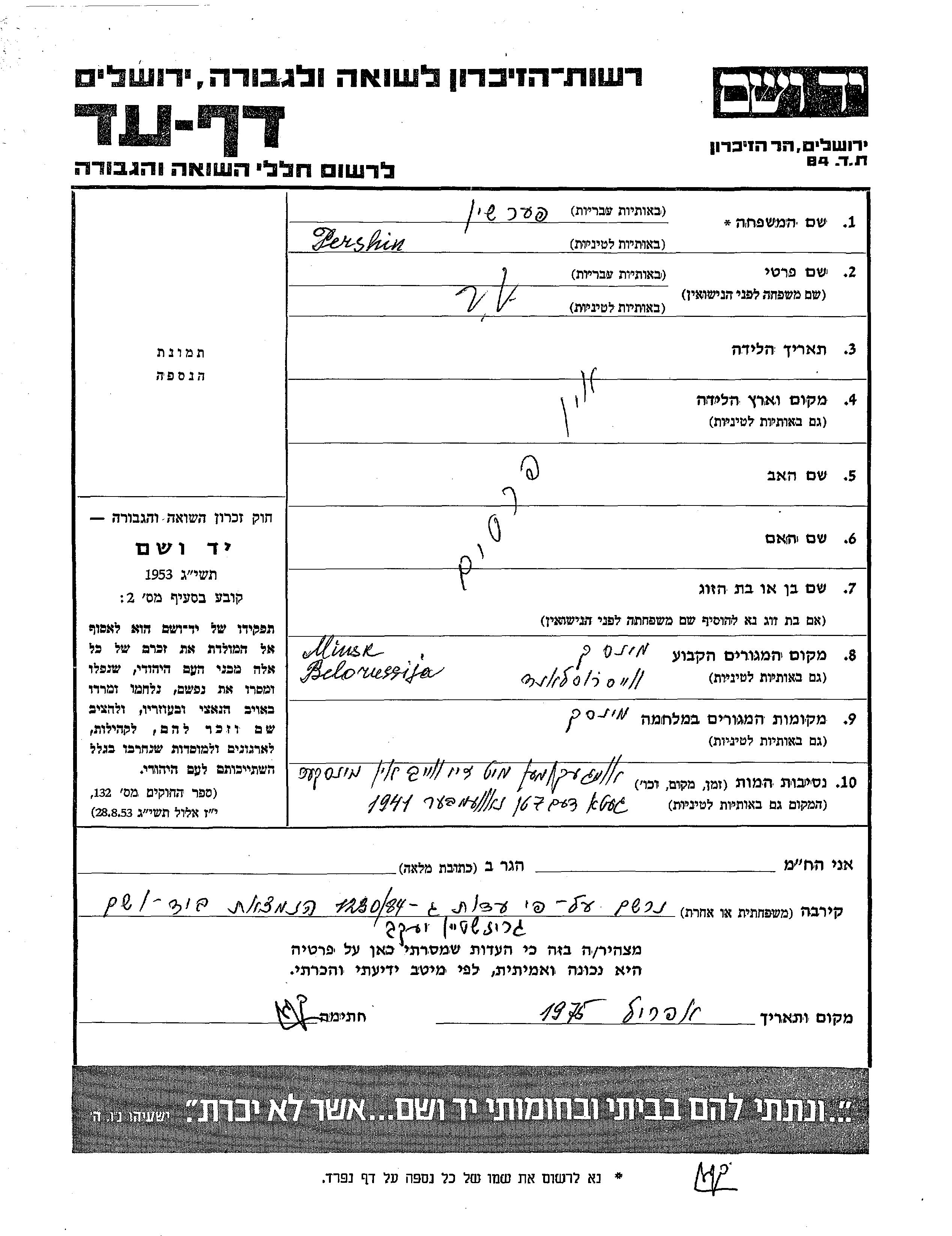 Vorname unbekannt Pershin. Vor dem Zweiten Weltkrieg er/sie in Minsk, Weißrussland (UdSSR). Während des Krieges war er/sie in Minsk, Weißrussland (UdSSR).