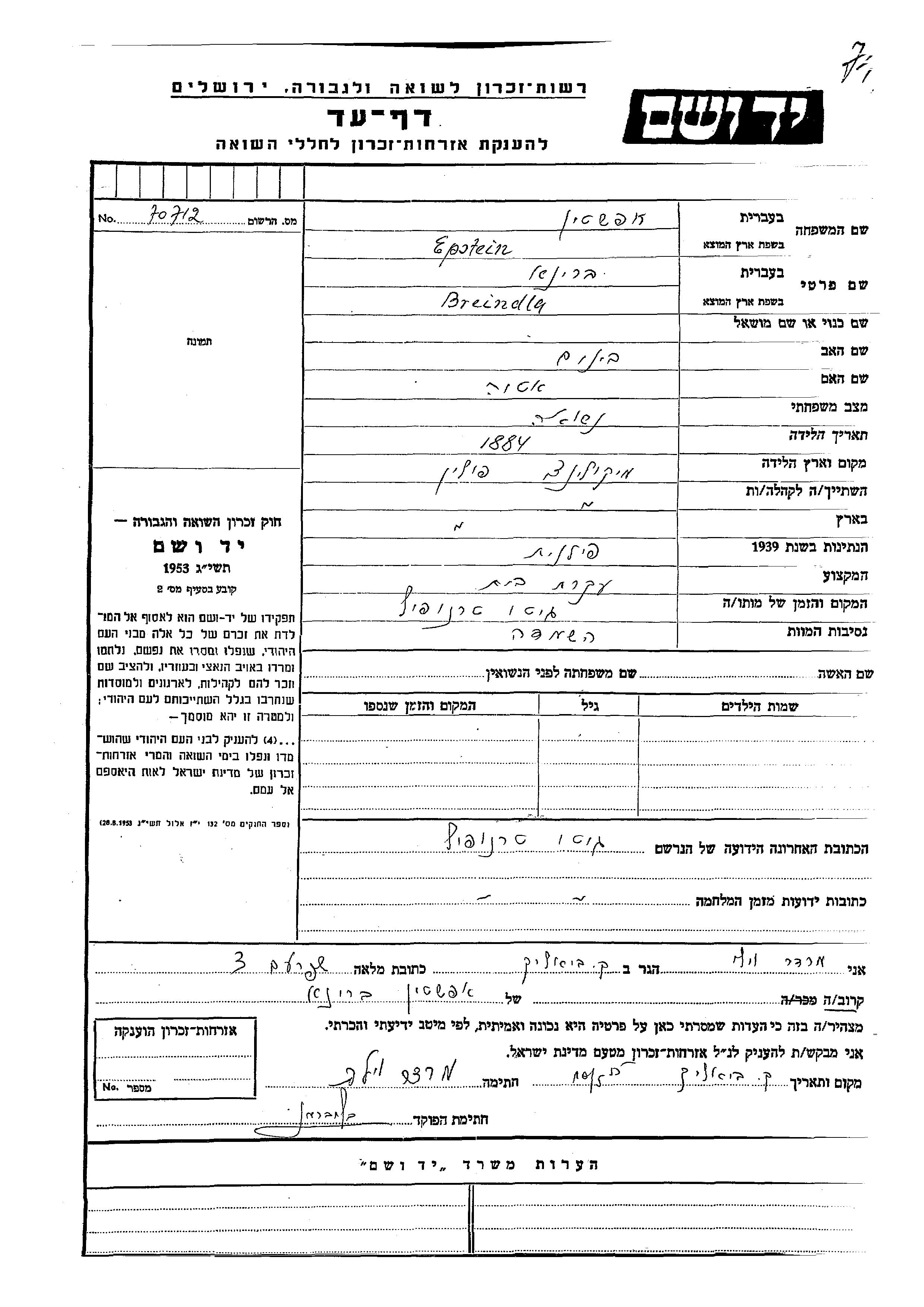 Breindla Epstein wurde im Jahr 1884 in Mikulince, Polen geboren. Sie war die Tochter von Binom und Etya. Sie war Hausfrau und Verheiratet. Vor dem Zweiten Weltkrieg lebte sie in Mikulince, Polen. Während des Krieges war sie in Tarnopol, Polen.