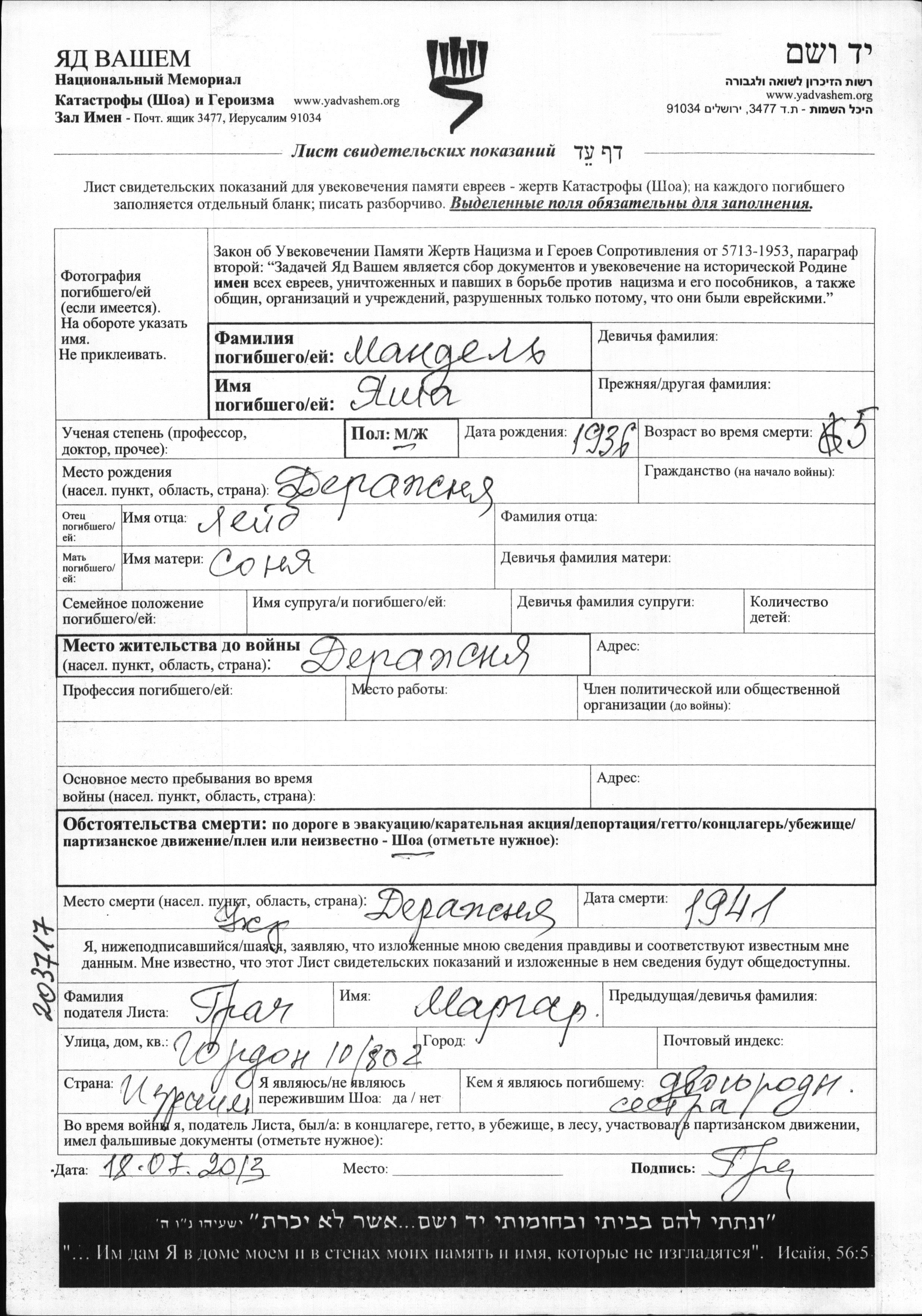 Yasha wurde in der Schoah ermordet. Todesort: Derazhnya, Ukraine (UdSSR) im Jahr 1941.