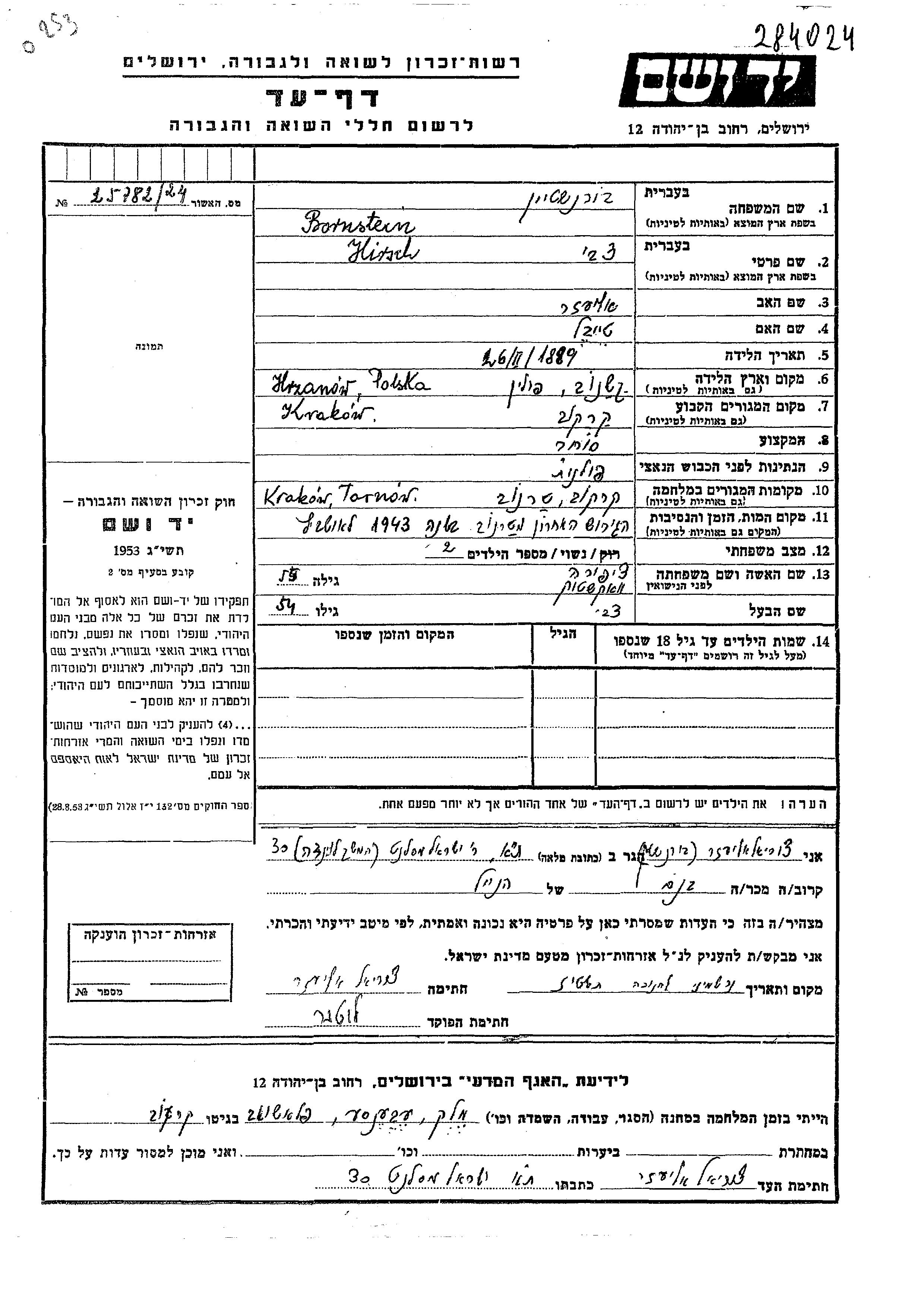 Hirsch Tzvi Bornstein wurde im Jahr 1889 in Kszanow, Polen geboren. Er war der Sohn von Eliezer und Teibel. Er war Kaufmann/-frau und mit Tzipora, geb. Wachsstock Verheiratet. Vor dem Zweiten Weltkrieg lebte er in Krakow, Polen. Während des Krieges war er in Tarnow, Polen.