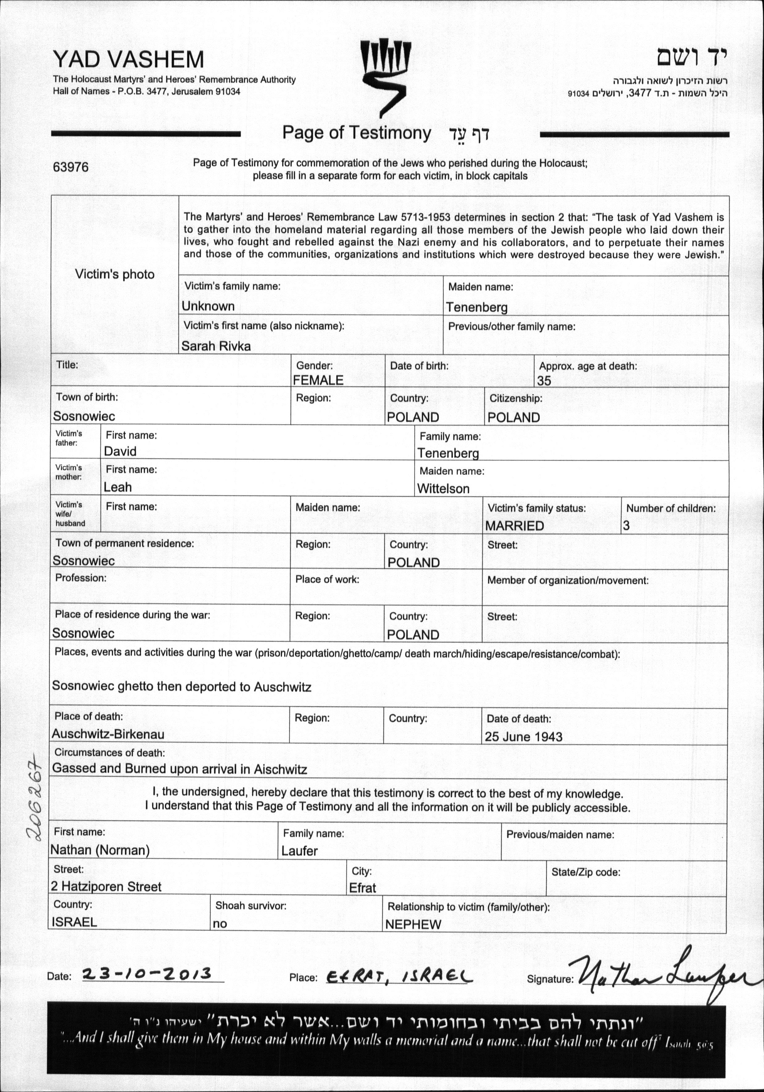 Sarah Rivka Name unbekannt, geb. Tenenberg wurde in Sosnowiec, Polen geboren. Sie war die Tochter von David und Leah, geb. Wittelson. Sie war Verheiratet. Vor dem Zweiten Weltkrieg lebte sie in Sosnowiec, Polen. Während des Krieges war sie in Sosnowiec, Polen.