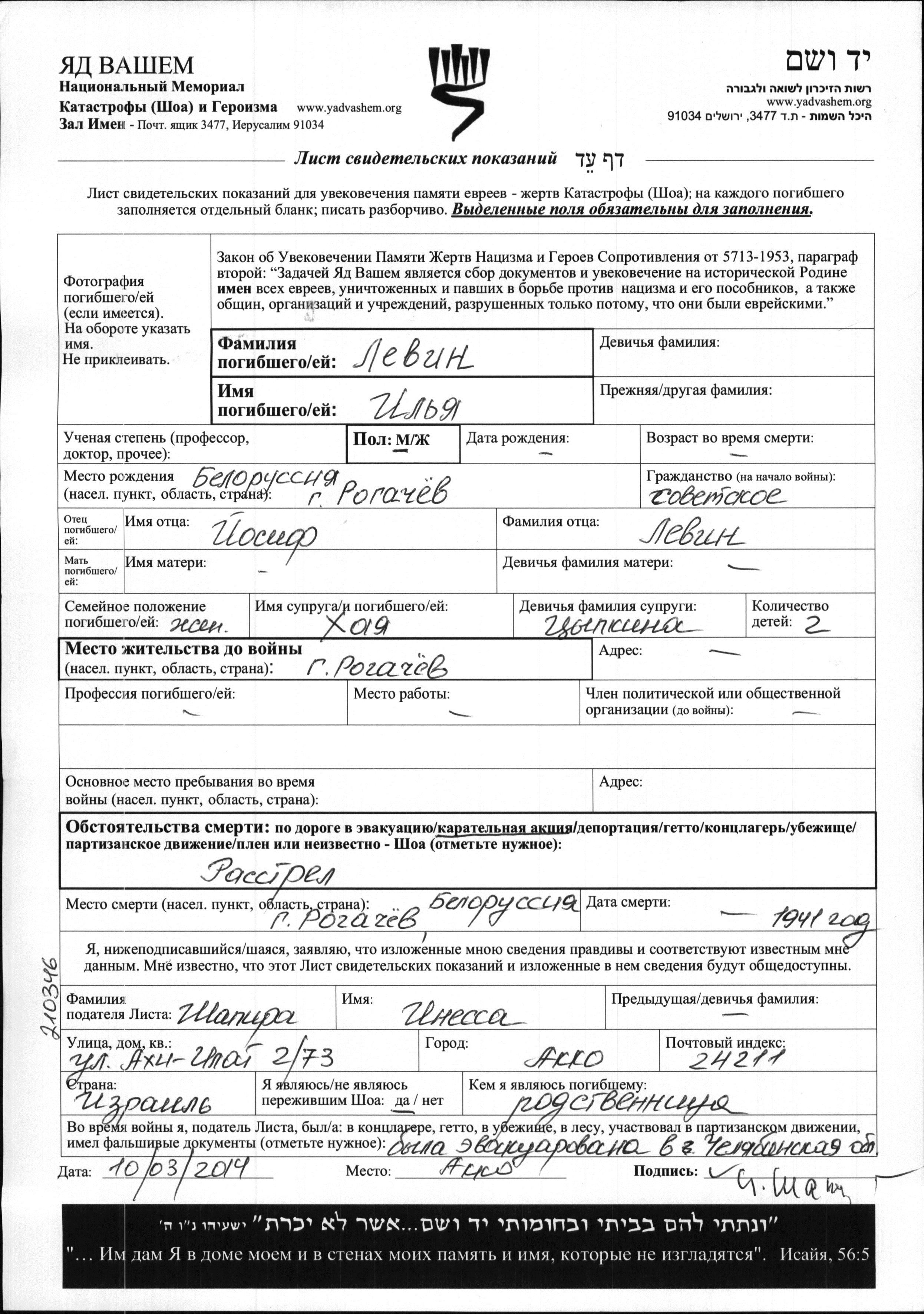 Ilya Levin wurde in Rogachev, Weißrussland (UdSSR) geboren. Er war der Sohn von Yosif. Er war mit Khaya, geb. Tzypkina Verheiratet. Vor dem Zweiten Weltkrieg lebte er in Rogachev, Weißrussland (UdSSR). Während des Krieges war er in Rogachev, Weißrussland (UdSSR).