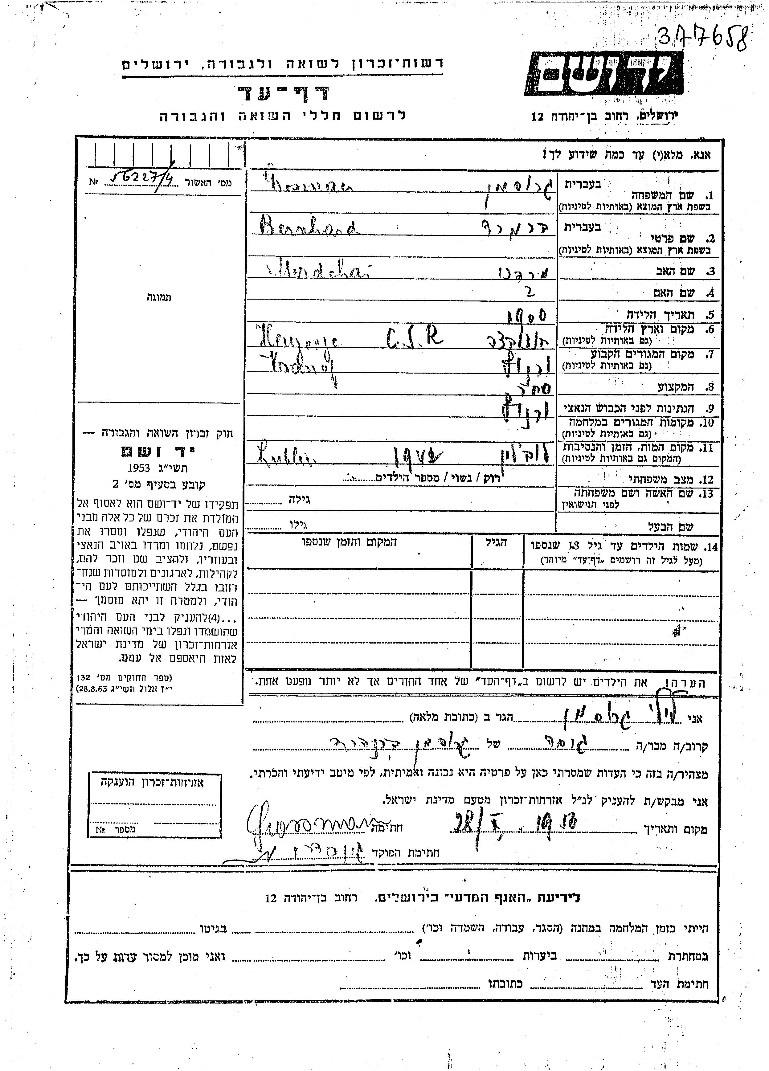 Bernhard wurde in der Schoah ermordet. Todesort: Lublin, Polen im Jahr 1942.